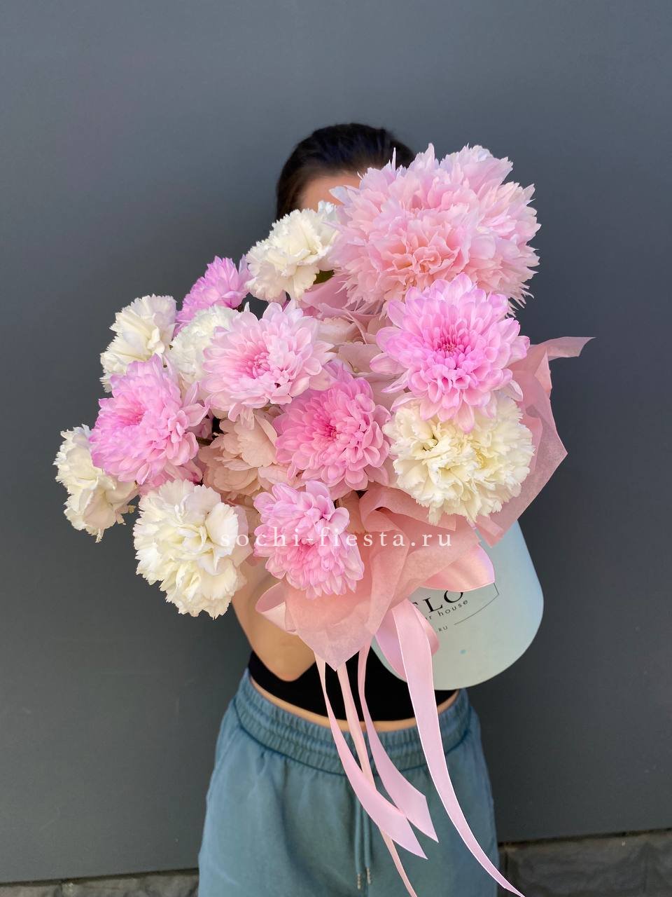 Пионы раскрываются пышными головками, окружённые воздушной статицей и многослойной эустомой. Маттиола вносит лёгкую небрежность, а диантусы расставляют яркие точки в общей картине.