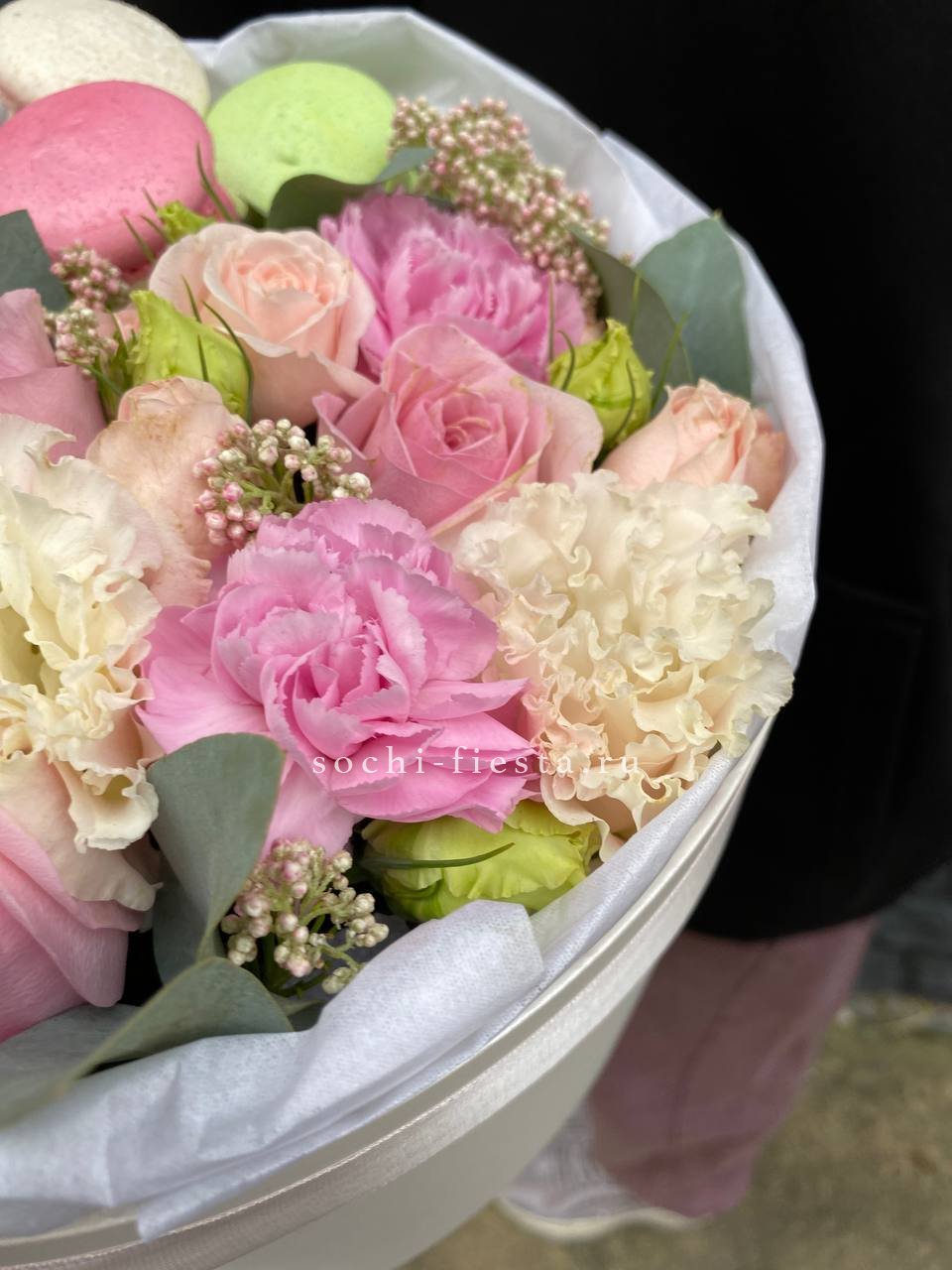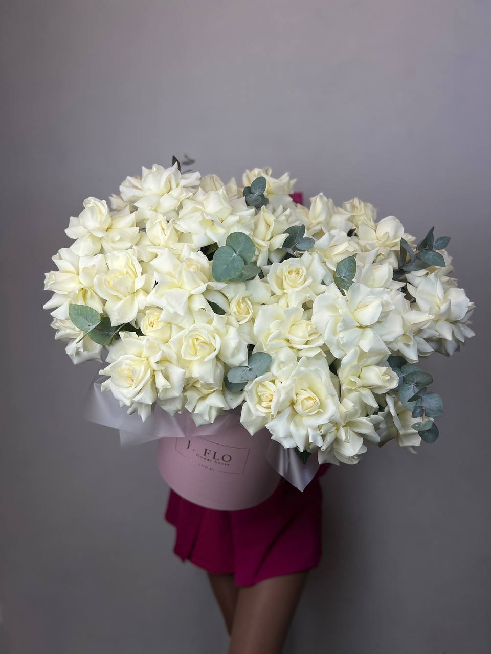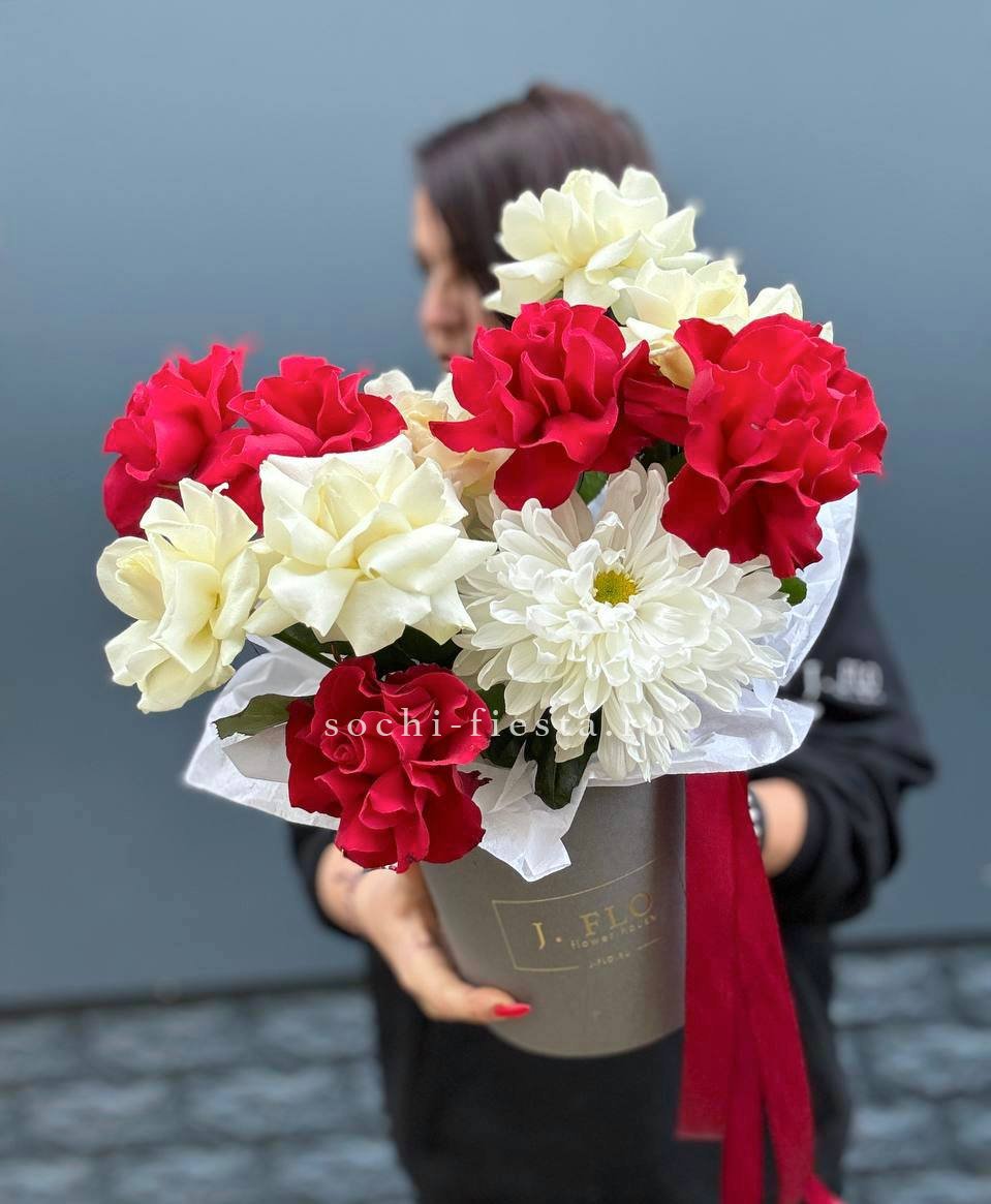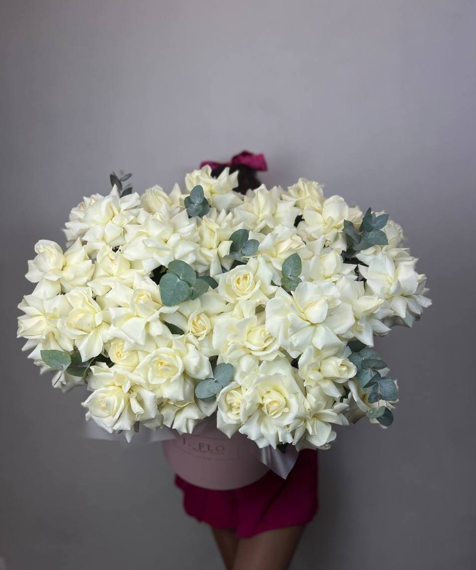 Белоснежные розы и герберы выстраивают чистую цветовую гамму с яркими акцентами диантусов. Эвкалипт вносит графичность и природную фактуру в общую композицию.