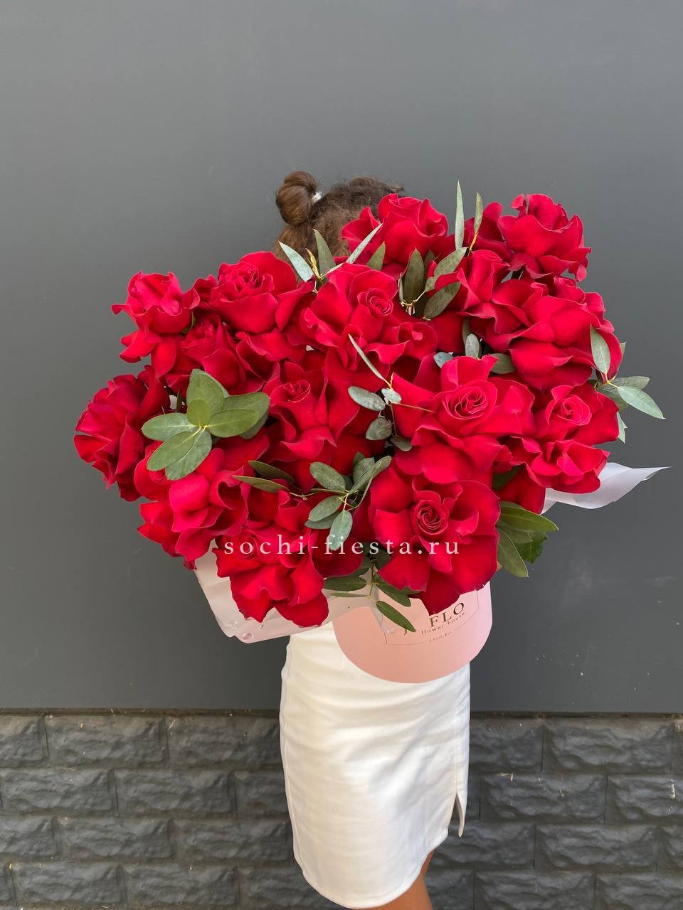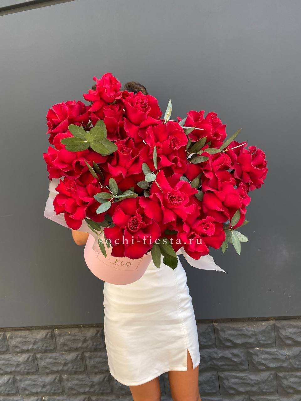 Французские розы раскрываются густыми бутонами насыщенного красного оттенка. Бокс сохраняет их свежесть и позволяет любоваться каждым лепестком без отвлекающих деталей.
