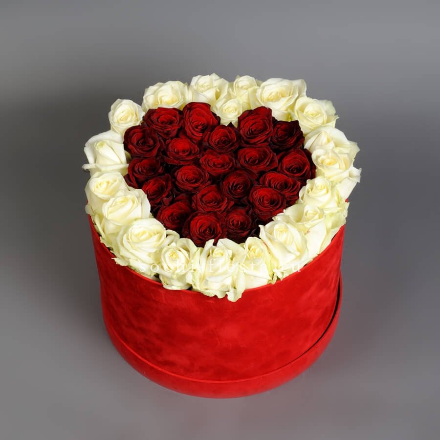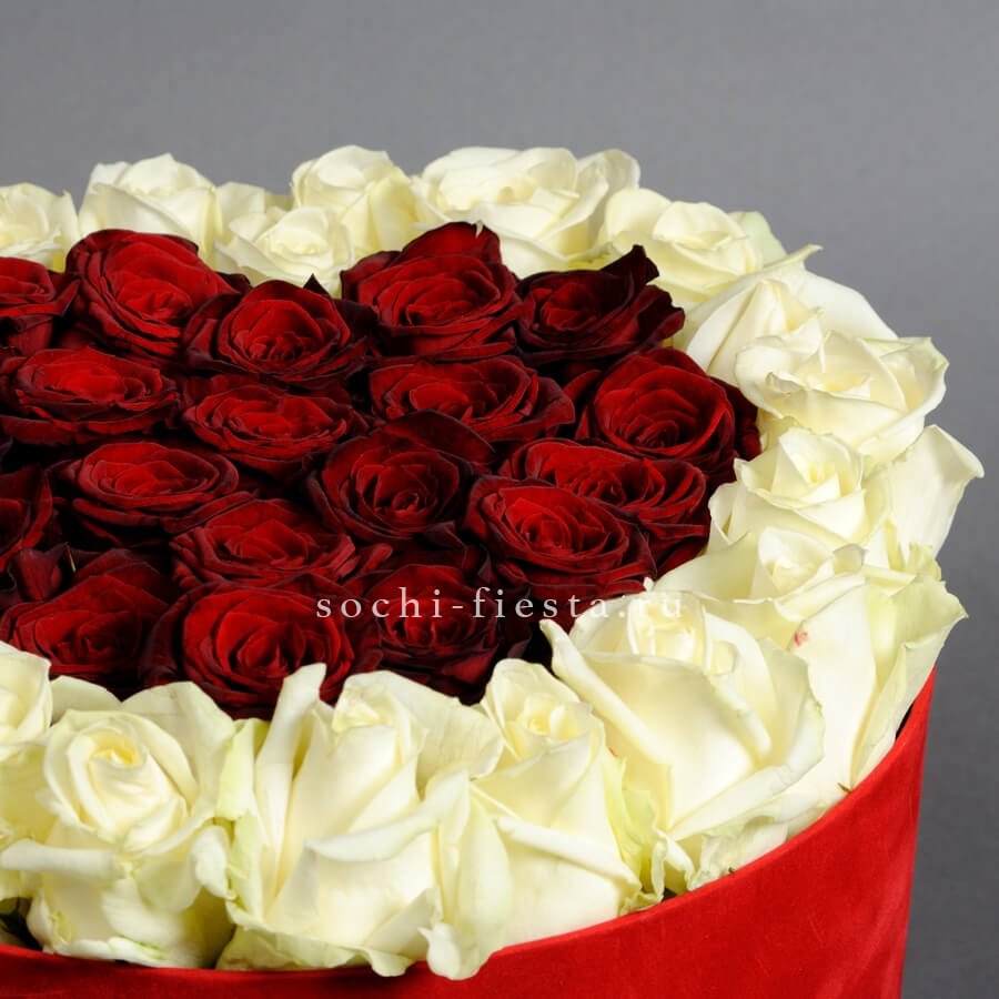 Красные розы и белые цимбидиумы собраны в круглом боксе с атласной лентой. Плотная укладка бутонов создаёт насыщенную композицию, где каждый цветок виден и различим. Классика флористики в удобном формате.