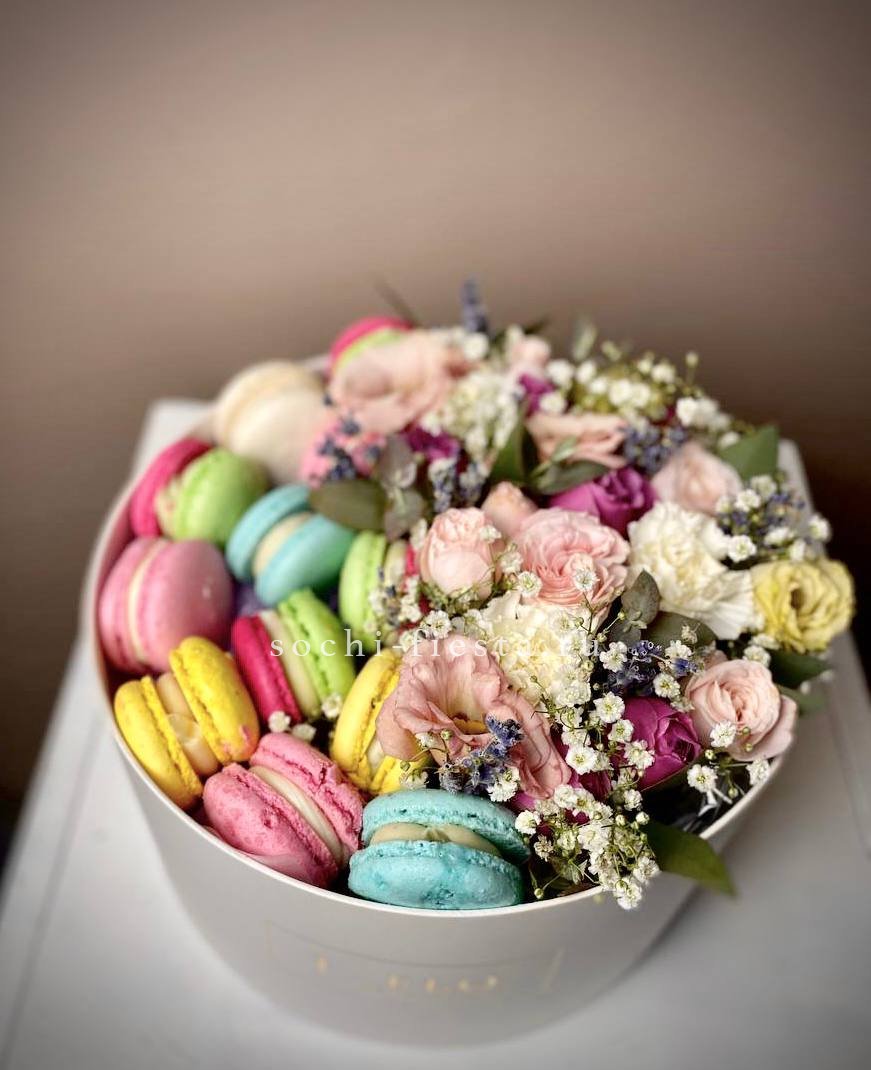 Пионовидные розы Мисти Баблс раскрываются пышными головками рядом с воздушной эустомой. Бархатистые лепестки создают объёмную текстуру, а макаронс добавляют сладкий акцент.