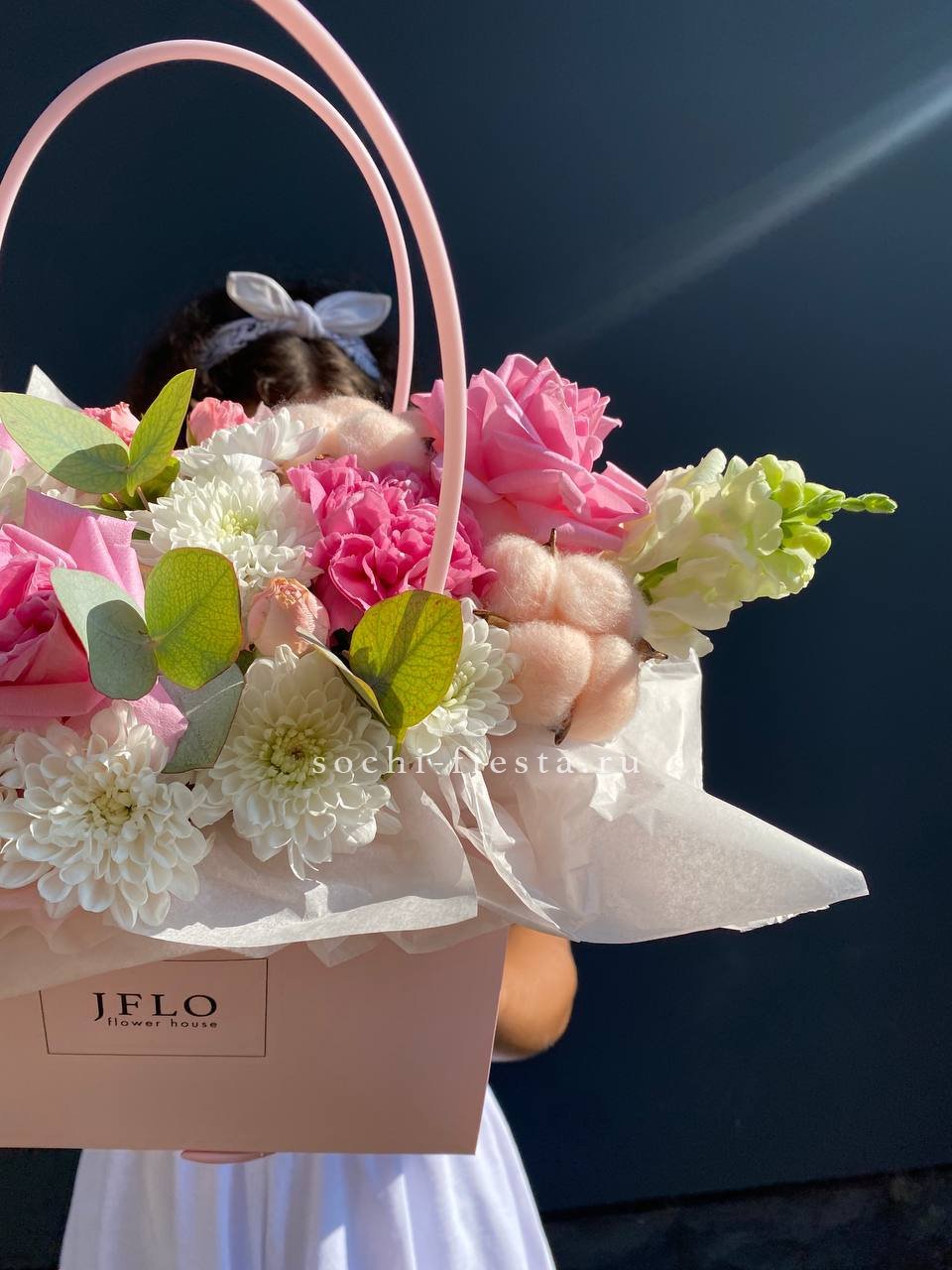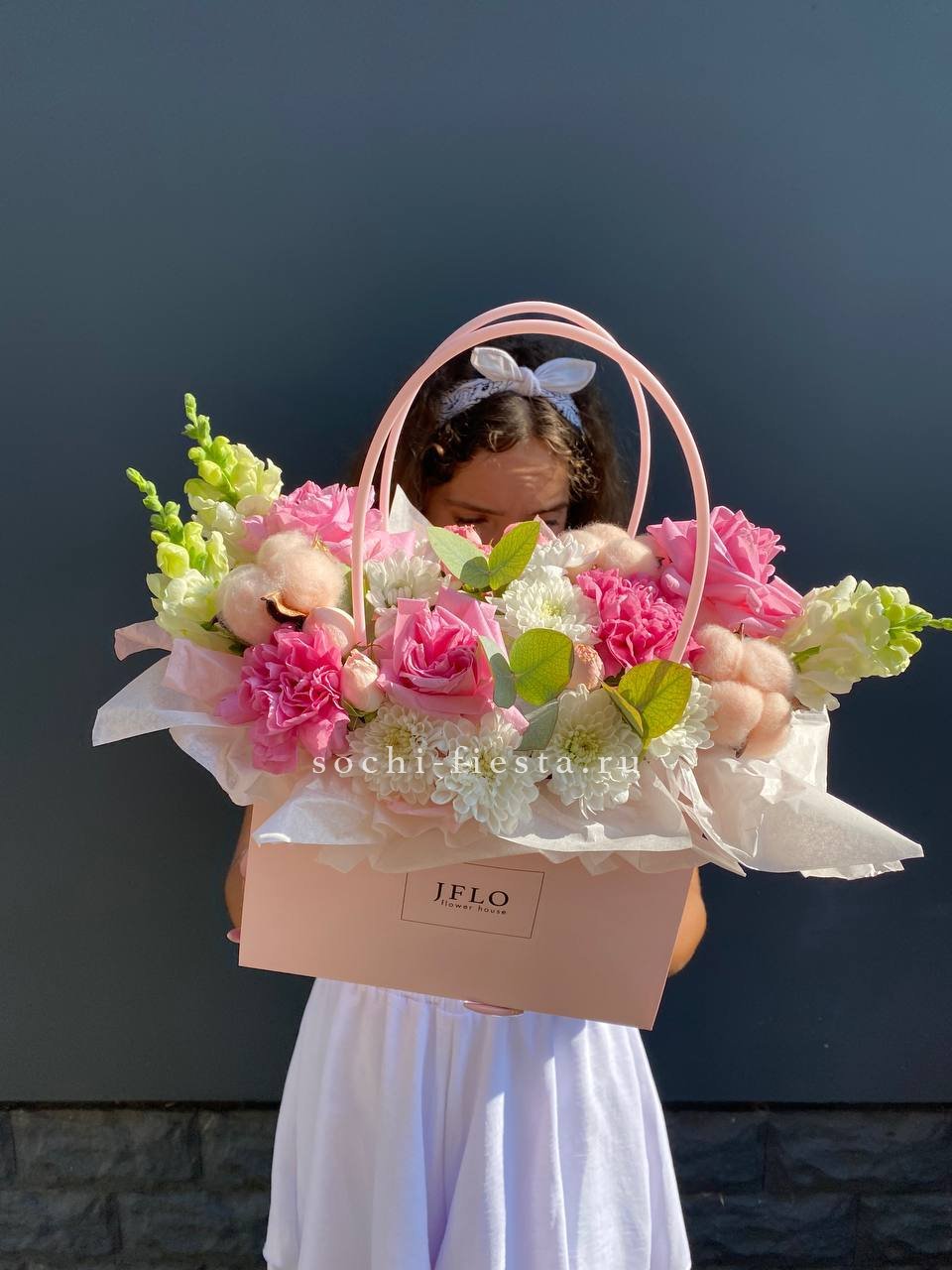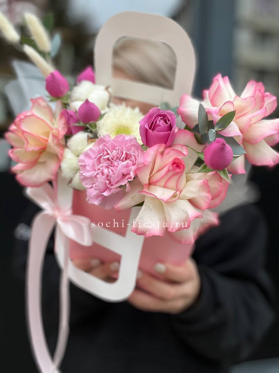 Пышные головки пионовидных роз задают объём, а мелкие соцветия диантуса разбивают плотность. Гортензия добавляет воздушную текстуру, эвкалипт смягчает линии. Композиция в сумке-кашпо выглядит свободно и живо.