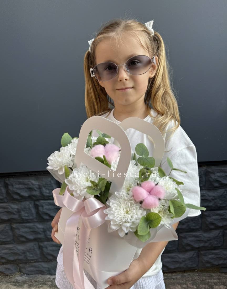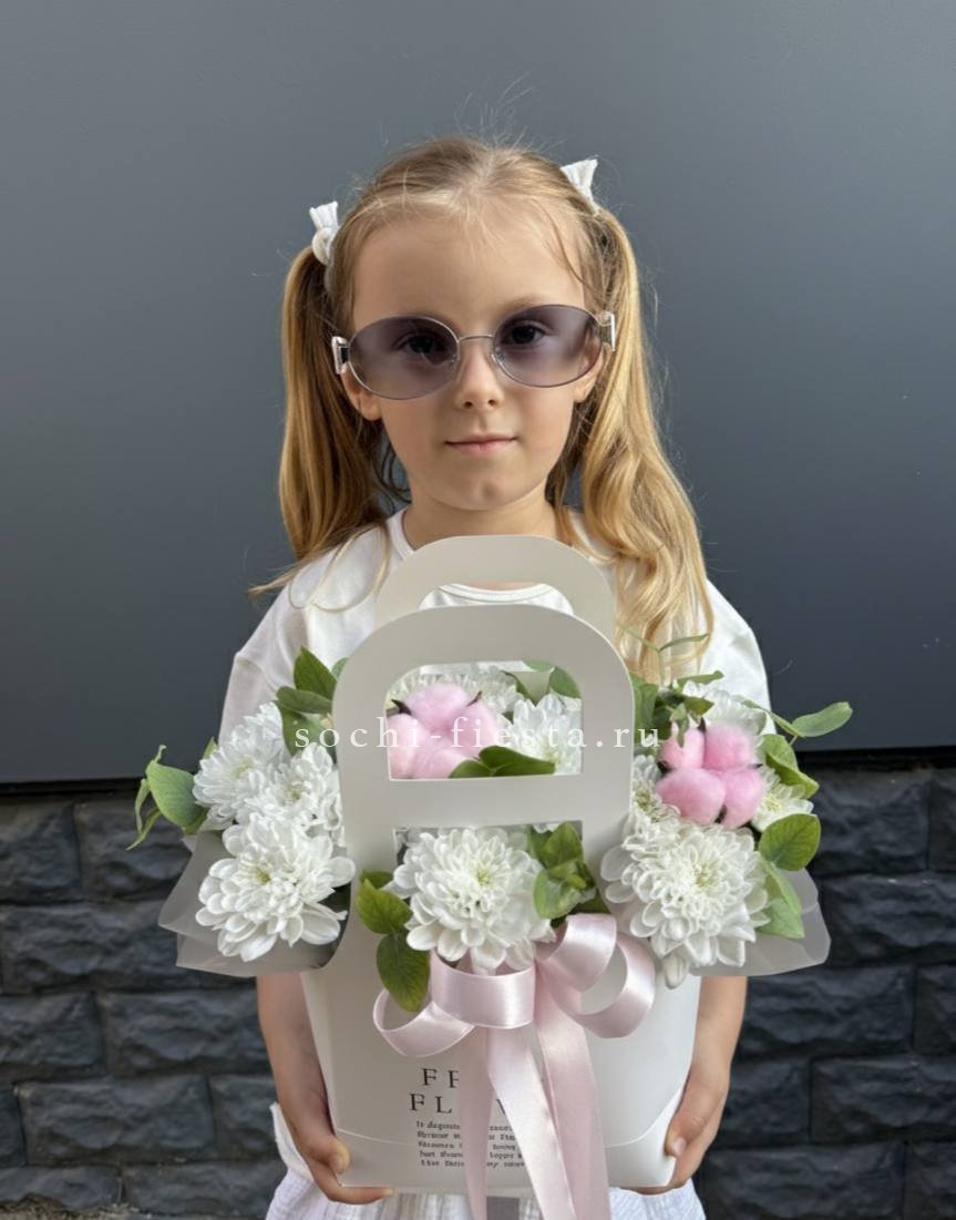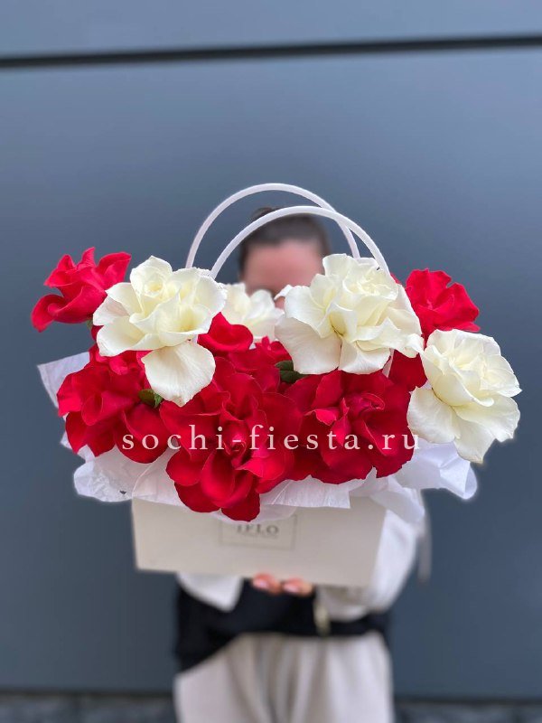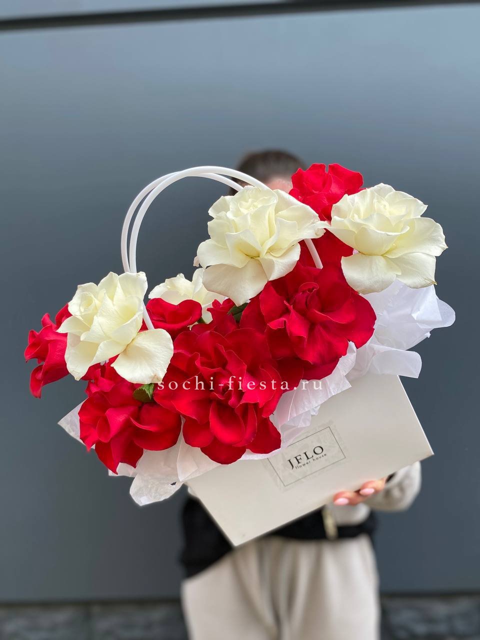 пионовидные кустовые розы, альстромерии, сумочка, лента.