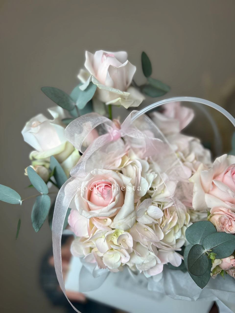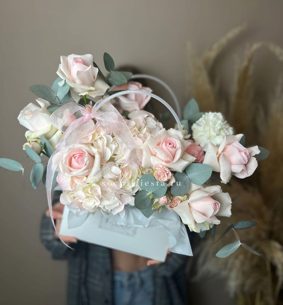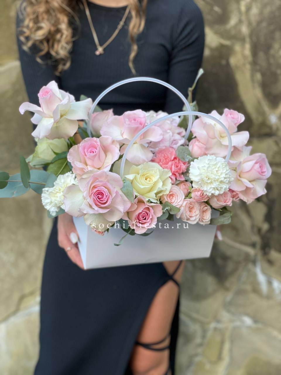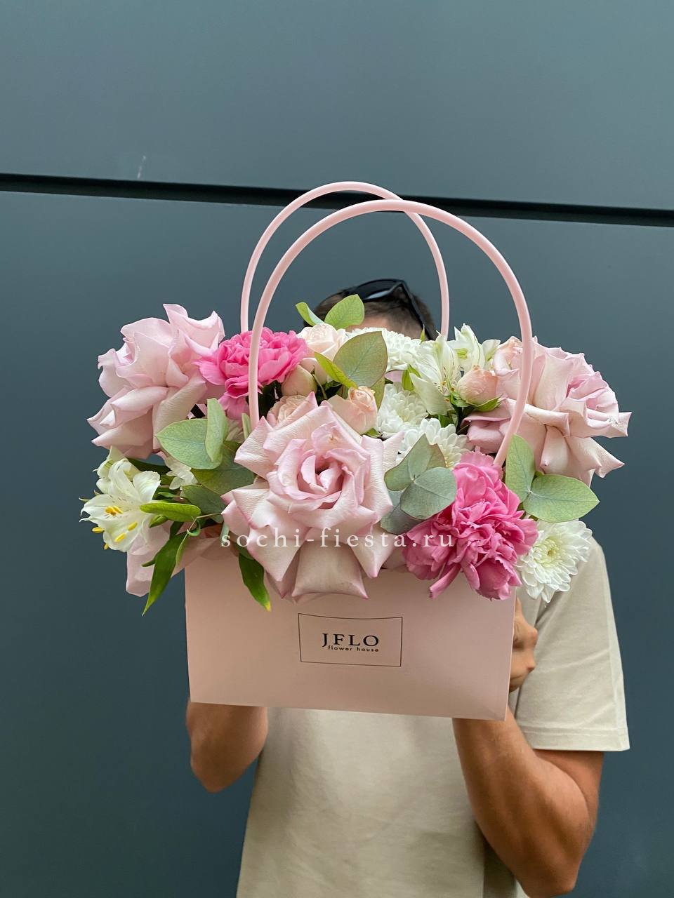 гортензия, джумилия, гербера, сумочка.