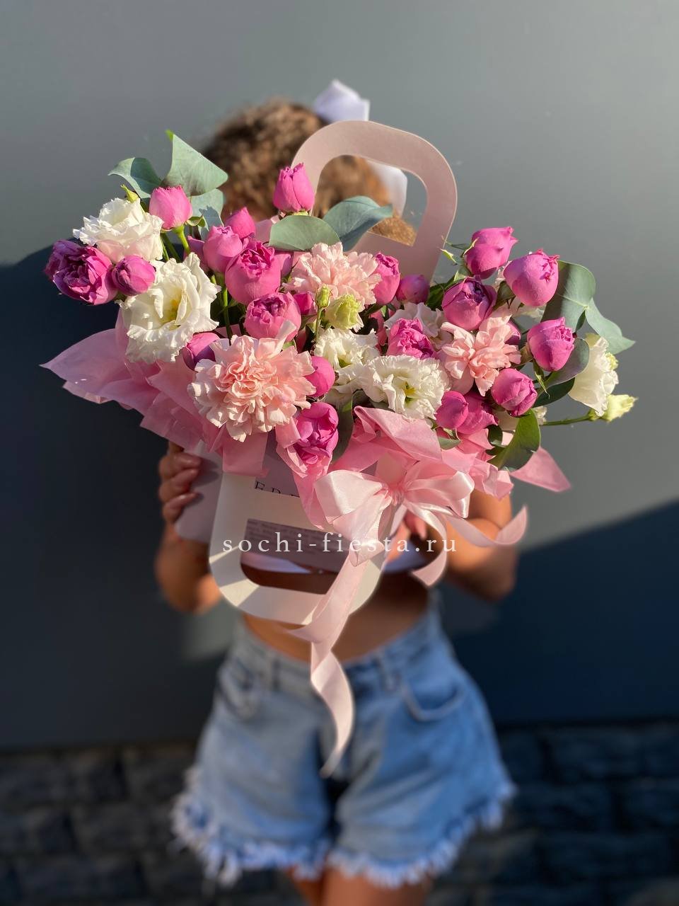 мисти баблс, диантус, эустома, сумочка.