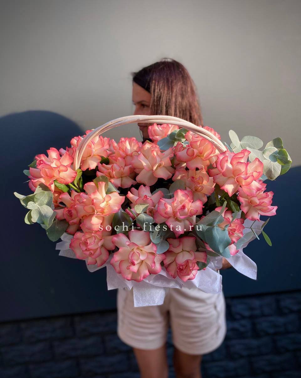 Пышная корзина с розами и гортензией раскрывается мягкими переходами розовых тонов. Эустома и диантус добавляют воздушности, а эвкалипт создает свежую основу для многослойной композиции. Авторская работа для важных событий и значимых встреч.