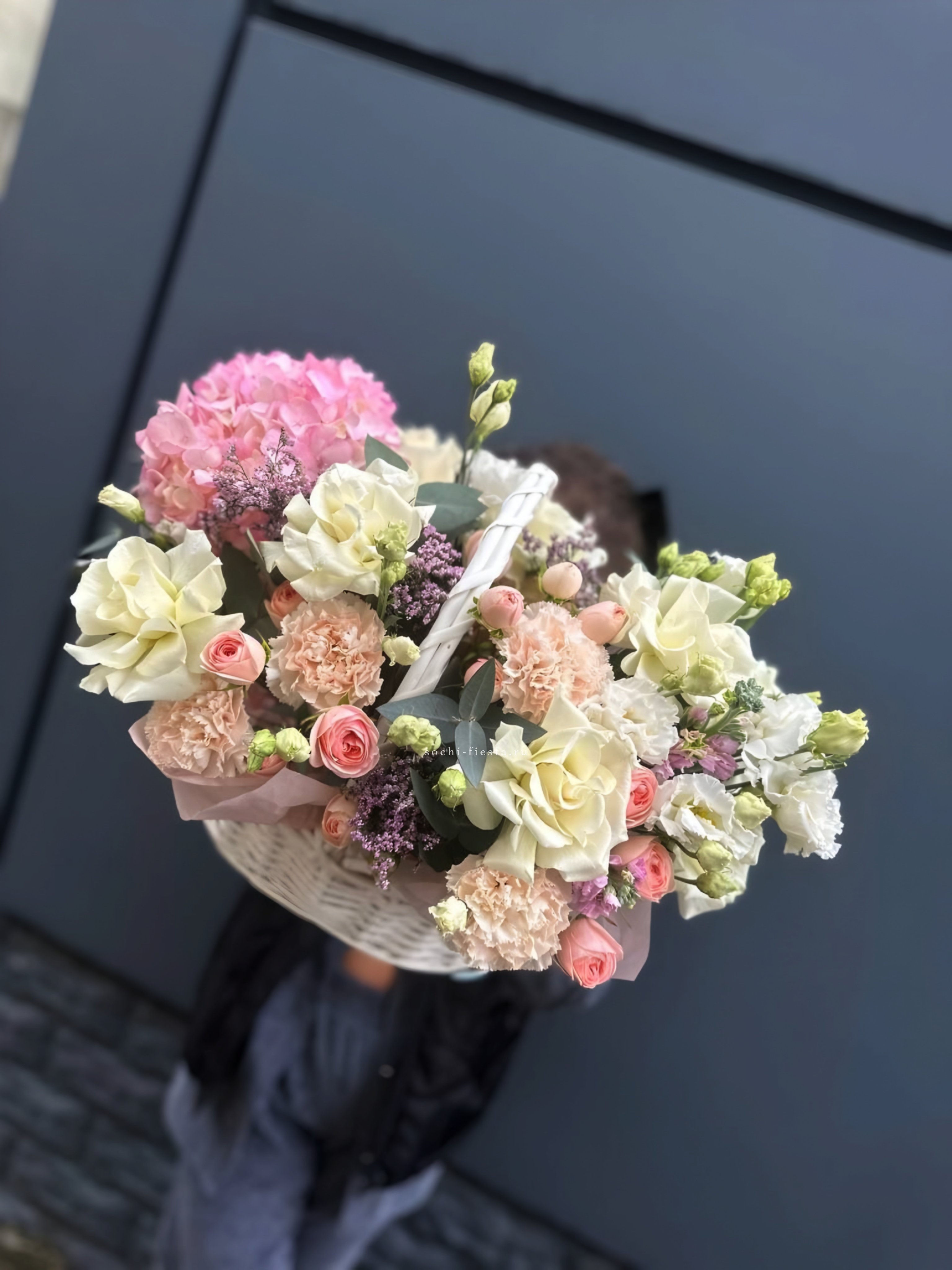 Пышная корзина с розами и гортензиями собрана плотно и объёмно. Маттиола добавляет живую текстуру между крупными соцветиями, а кустовые розы заполняют композицию мягкими переходами. Результат — впечатляющее присутствие, которое меняет восприятие пространства.