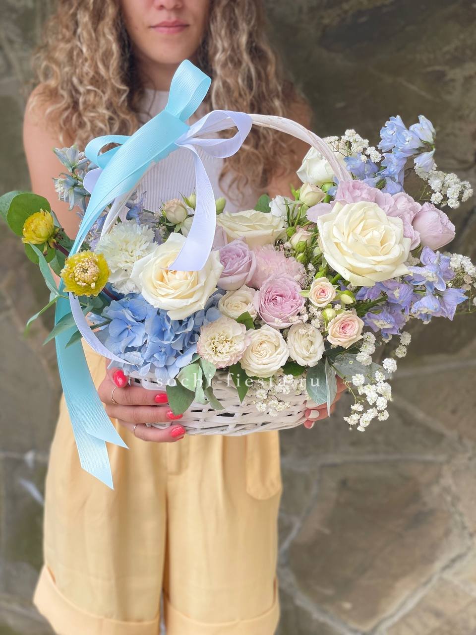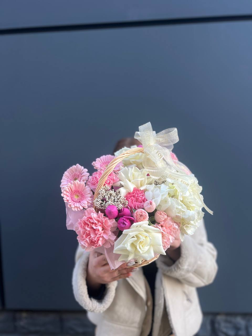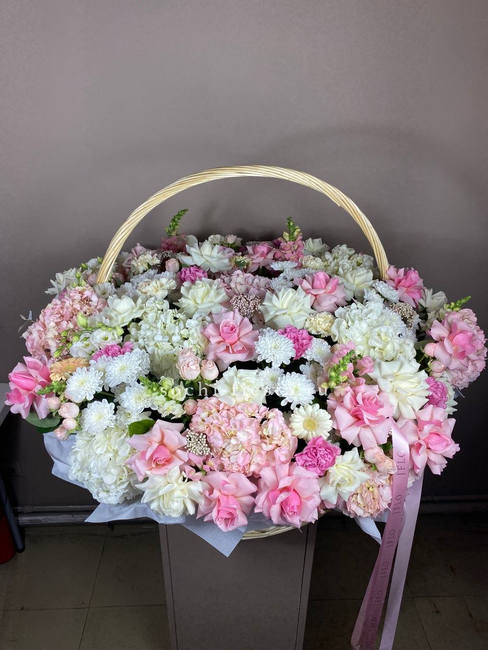 Здесь идеально сочетаются крупные, бархатистые бутоны роз, облака гортензии и мелкие акцентные цветы. Получилась невероятно воздушная и легкая композиция, которая мгновенно создает ощущение праздника и весеннего настроения. Стильный бант завершает этот изысканный образ.