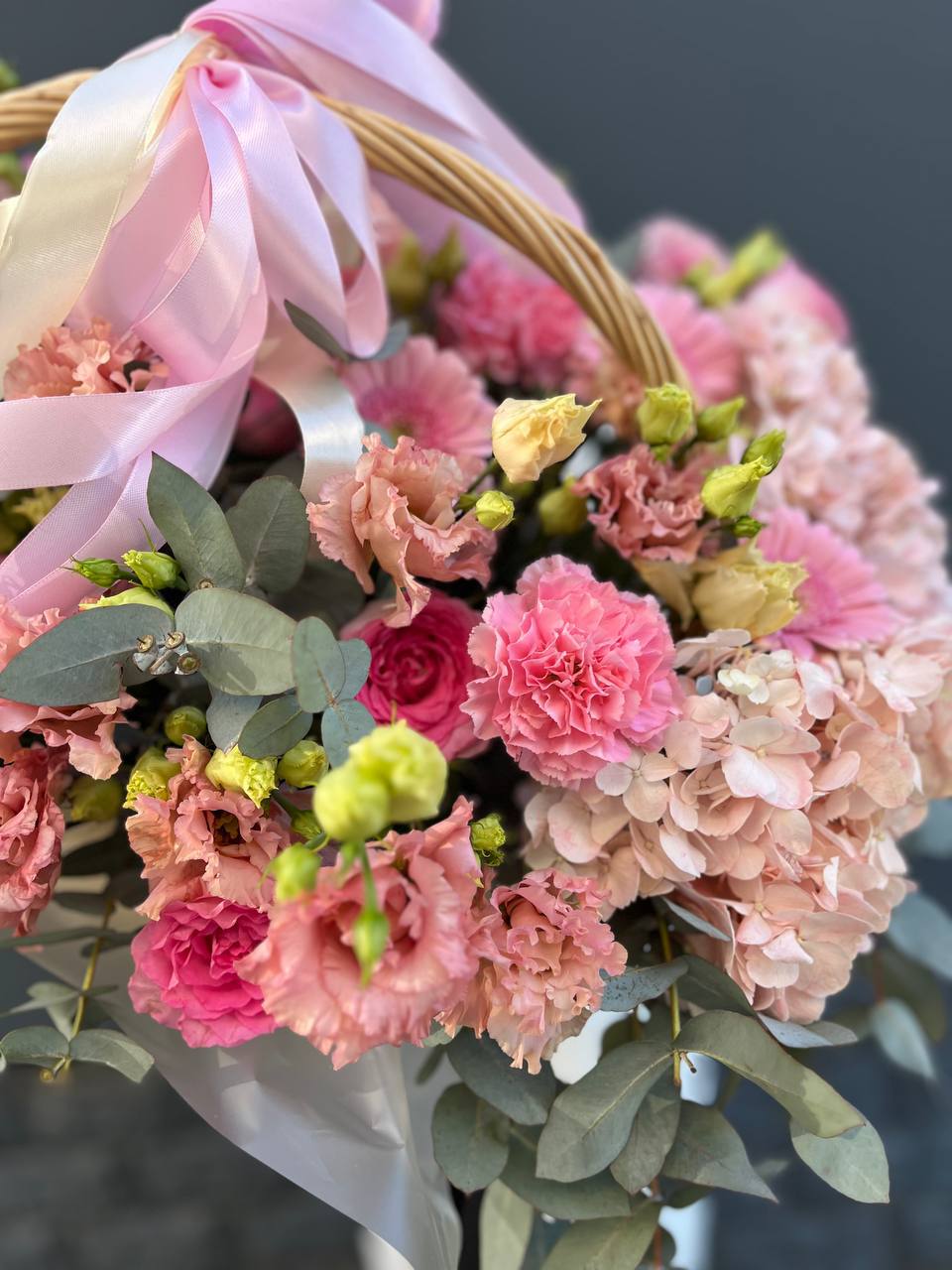 гербера, гортензия, диантус, хайди, эустома, эвкалипт, корзина средняя.