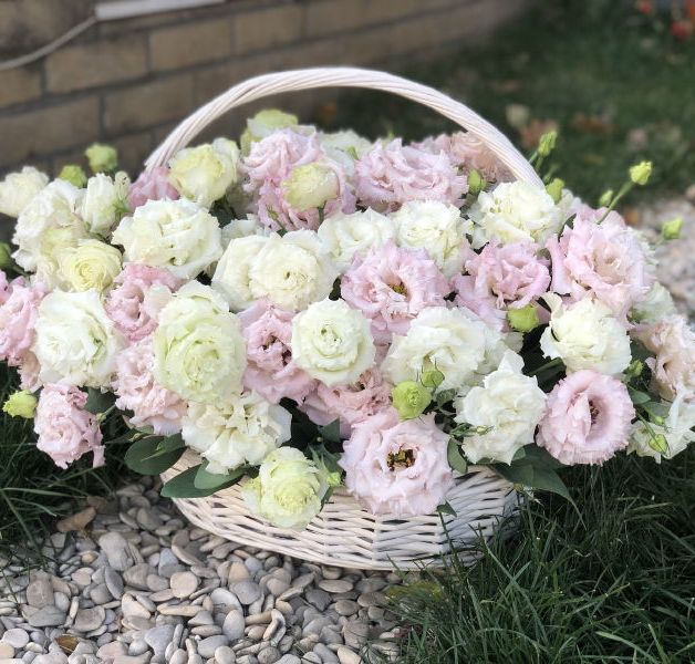 Воздушные соцветия эустомы собраны в округлую композицию с мягким переходом пастельных тонов. Светлая корзина создает легкую базу для объемной цветочной шапки.