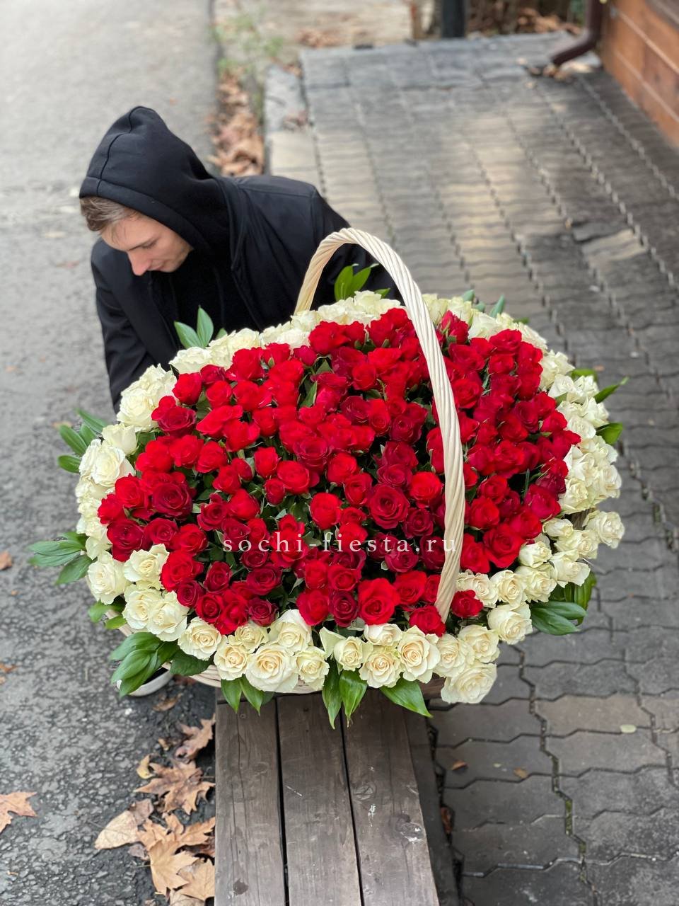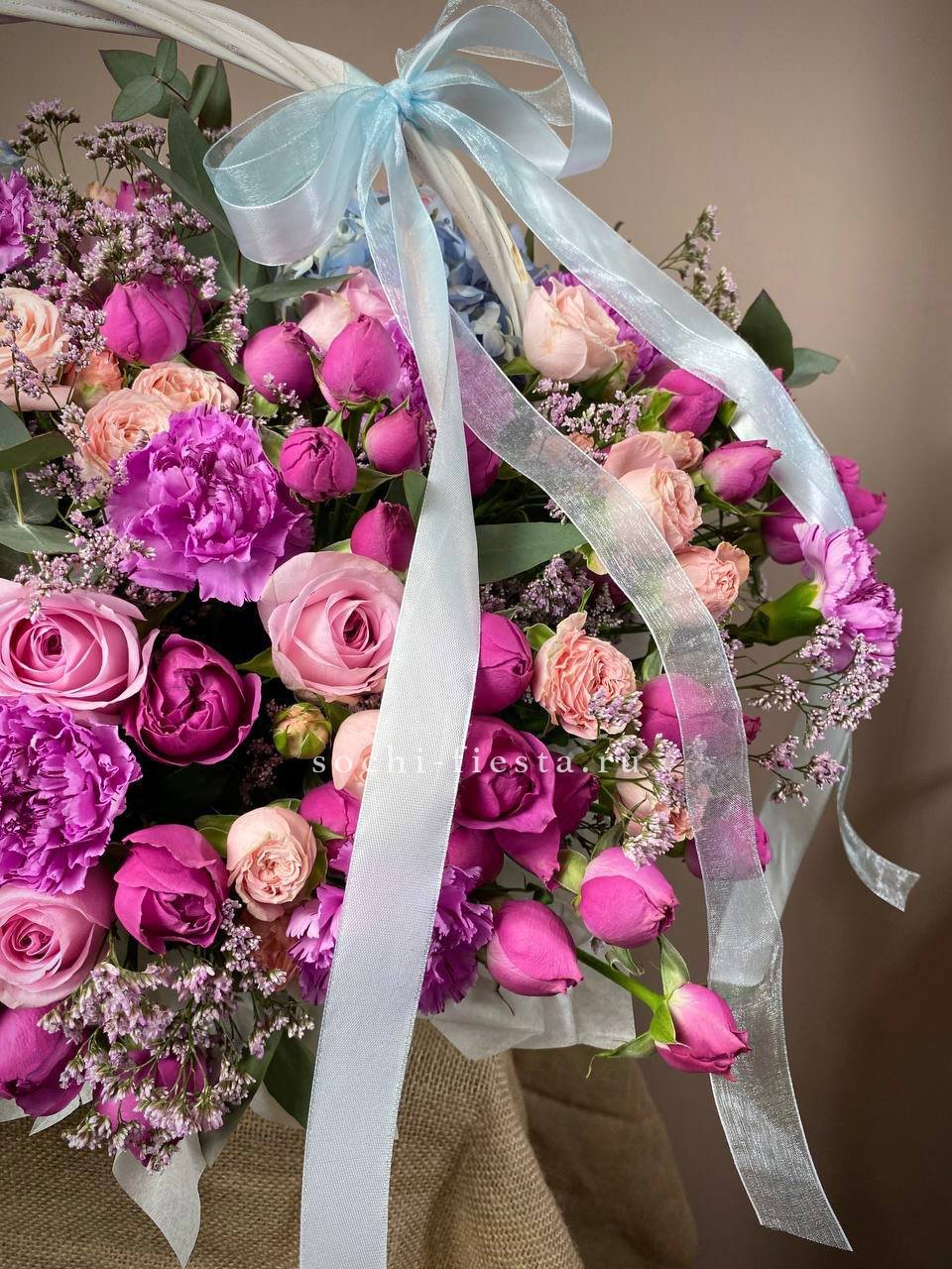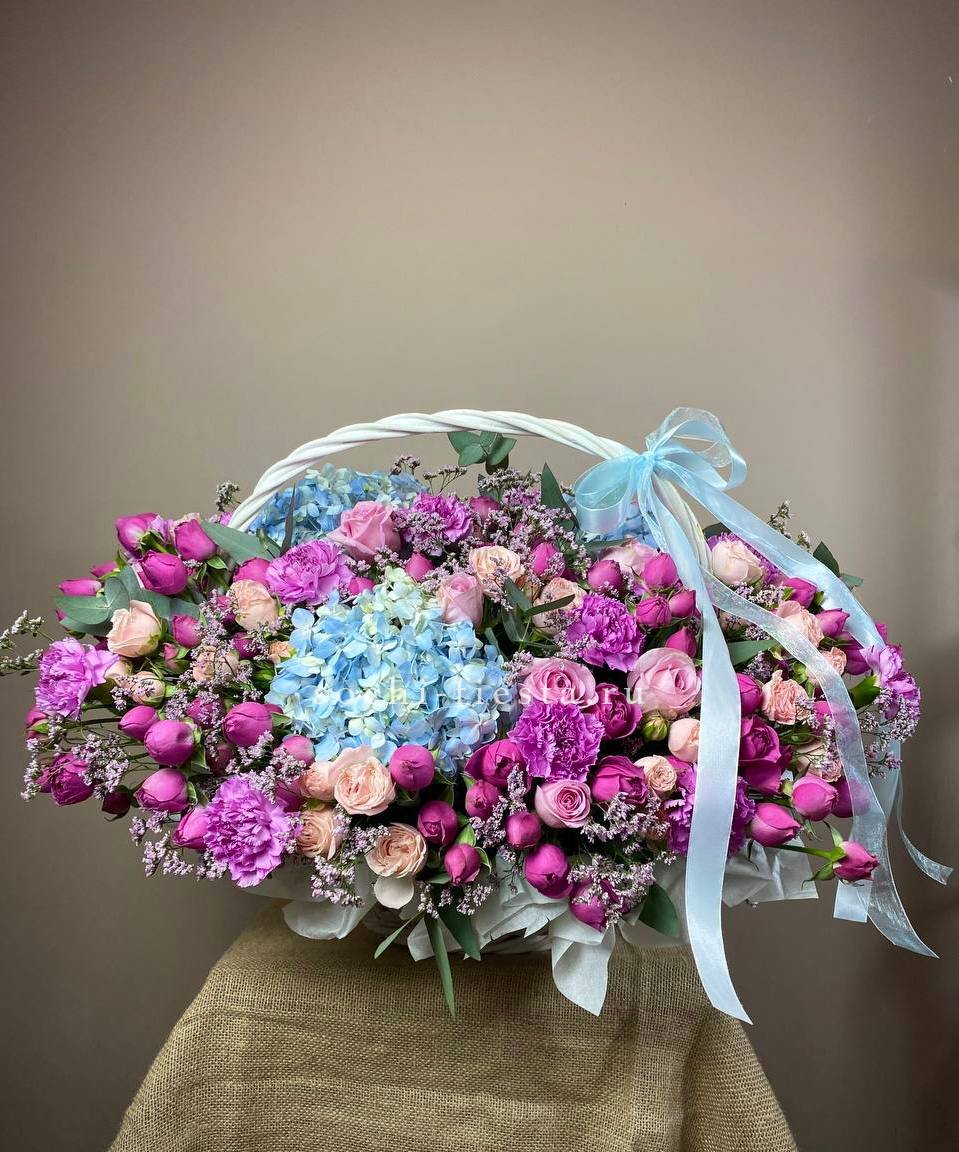 Корзина собрана плотно, каждый цветок находит своё место в общей композиции.