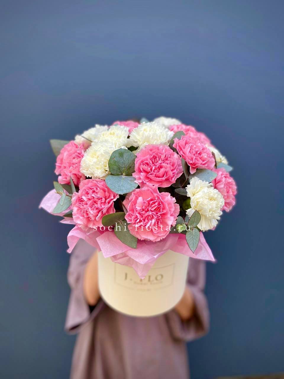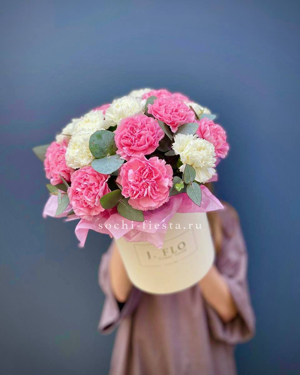 Диантусы с их густыми бутонами и резной формой лепестков выглядят графично и современно. Белый цвет усиливает архитектурность линий и создаёт чёткий визуальный ритм.