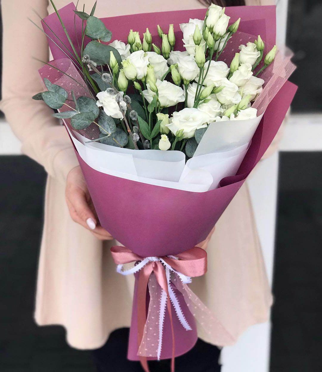 эустома - 21 шт., лента, упаковка фоамиран. Изначальная цена указана за букет Мини эустом- 7 шт.  Стандарт: 21 шт. эустомVIP: 41 шт.