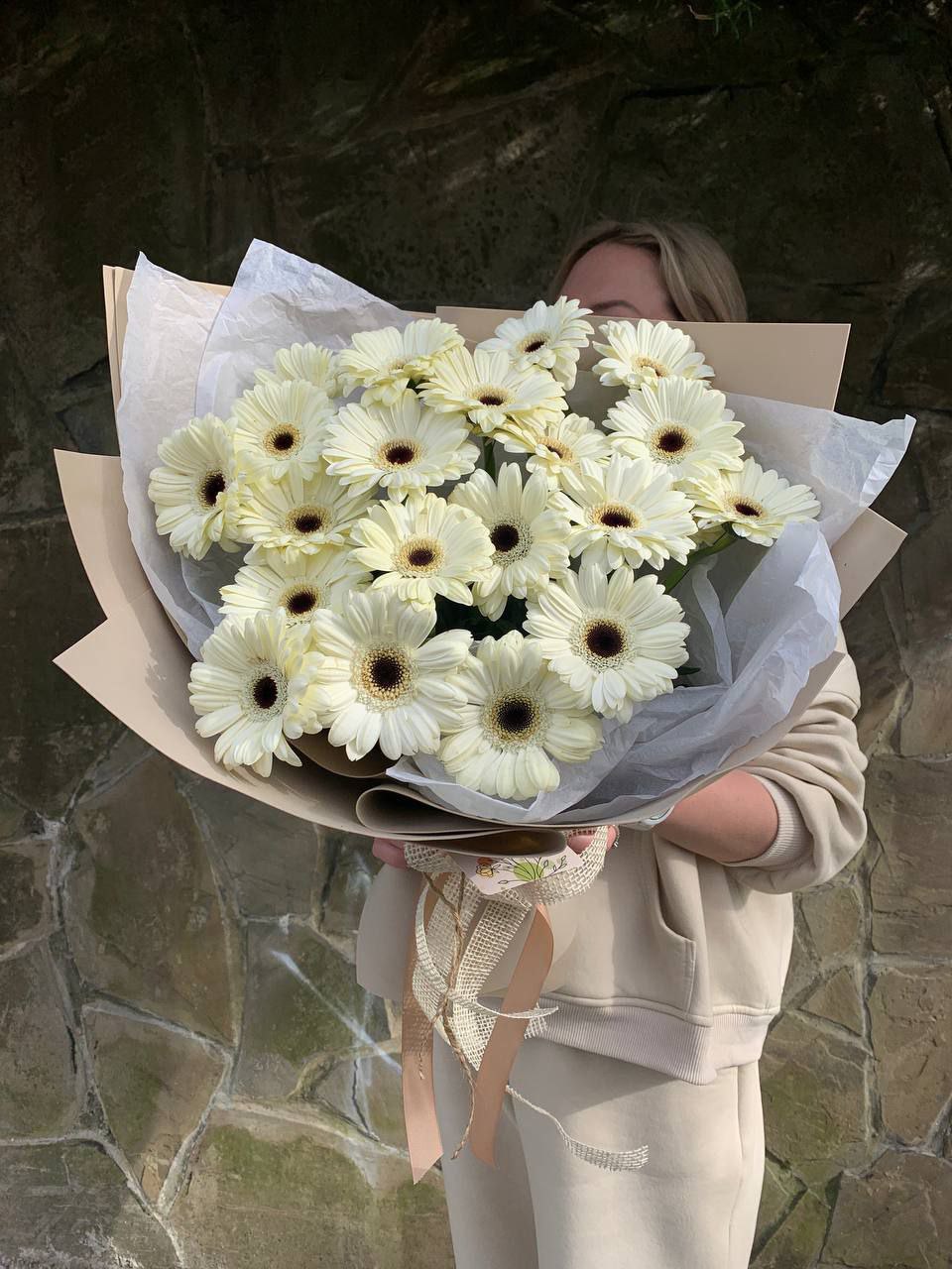 Пятьдесят один бутон под лентой — это объём и яркое присутствие в любом помещении. Герберы выстроены плотно, образуя впечатляющую композицию. Такой букет сложно не заметить.