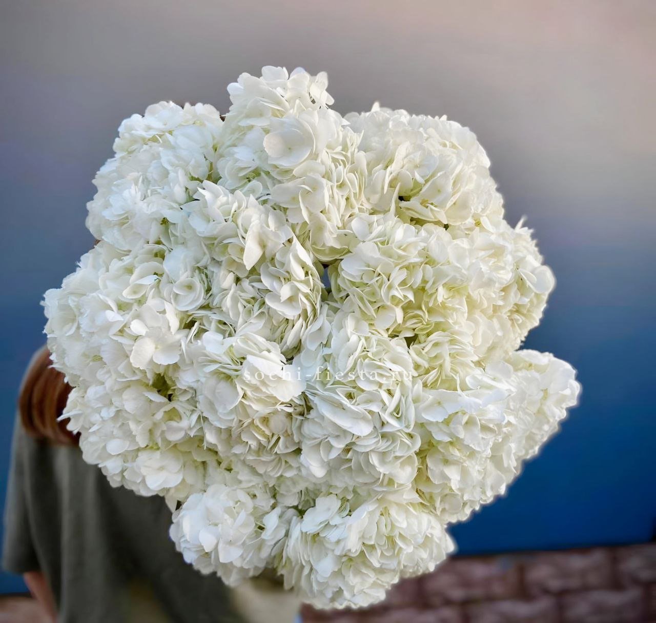Воздушные шапки соцветий собраны в пышную охапку белоснежного цвета. Гортензия создаёт объёмную текстуру и заполняет пространство мягким природным светом. Букет для тех, кто ценит чистоту линий и естественную красоту.