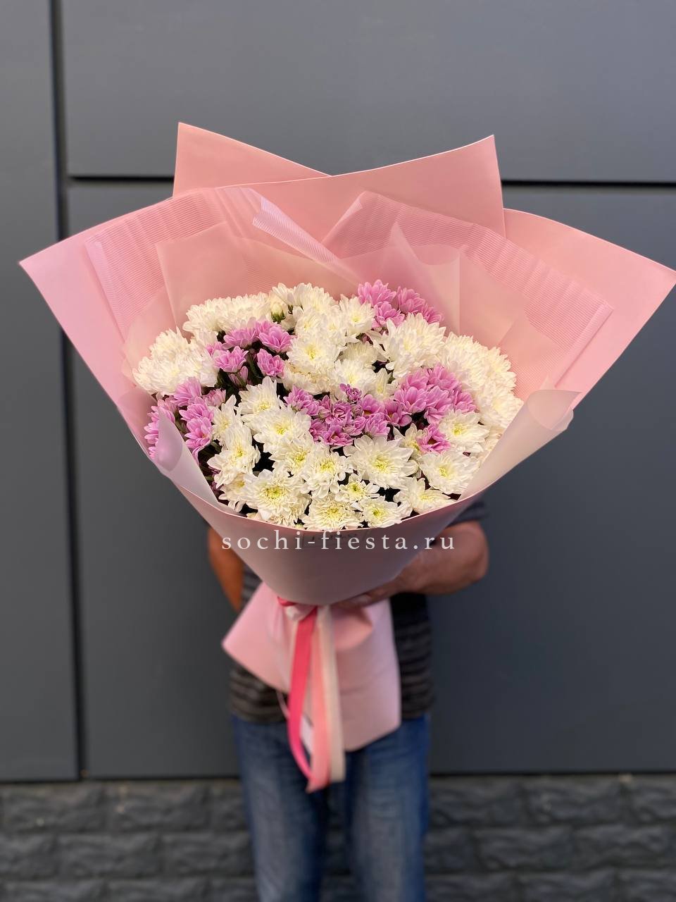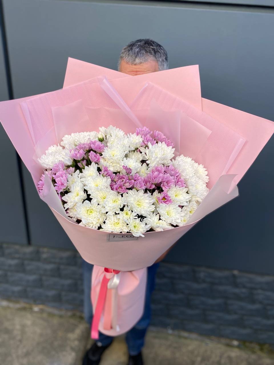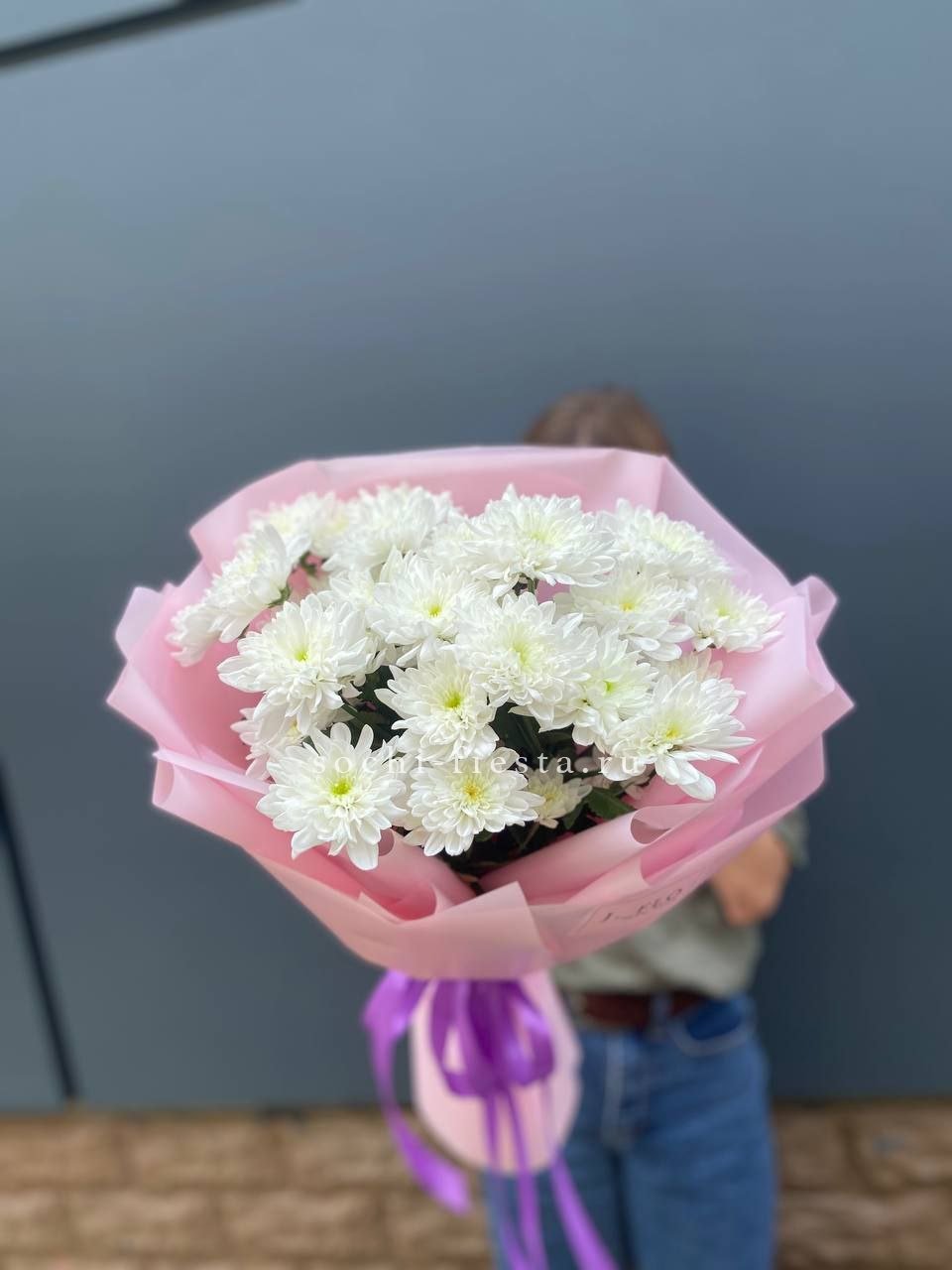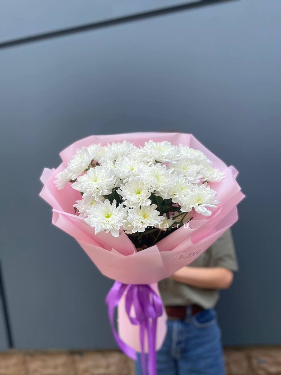 Пушистые коробочки хлопка добавляют воздушности между соцветиями хризантем. Природная фактура встречается с декоративной упаковкой в компактной форме. Букет держит объём и выглядит свежо несколько дней.