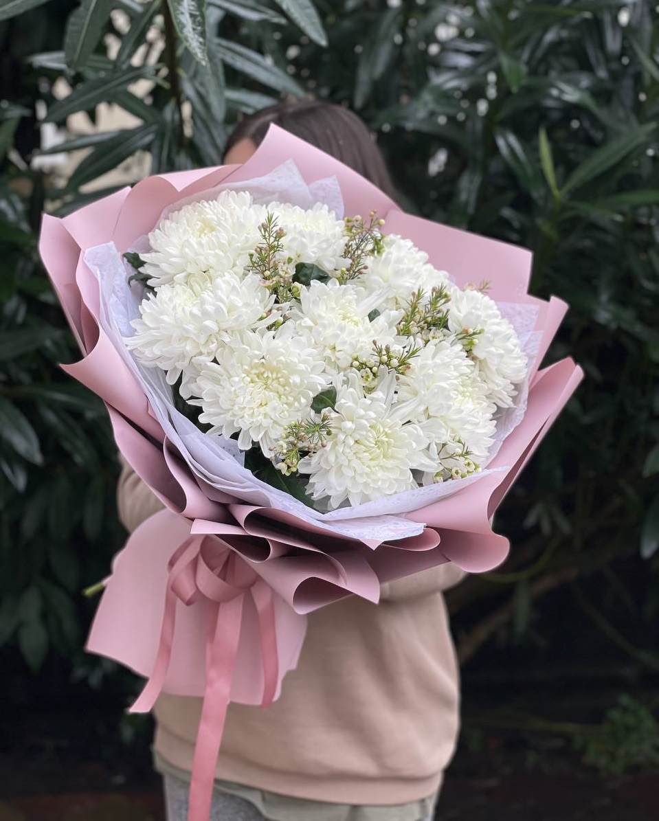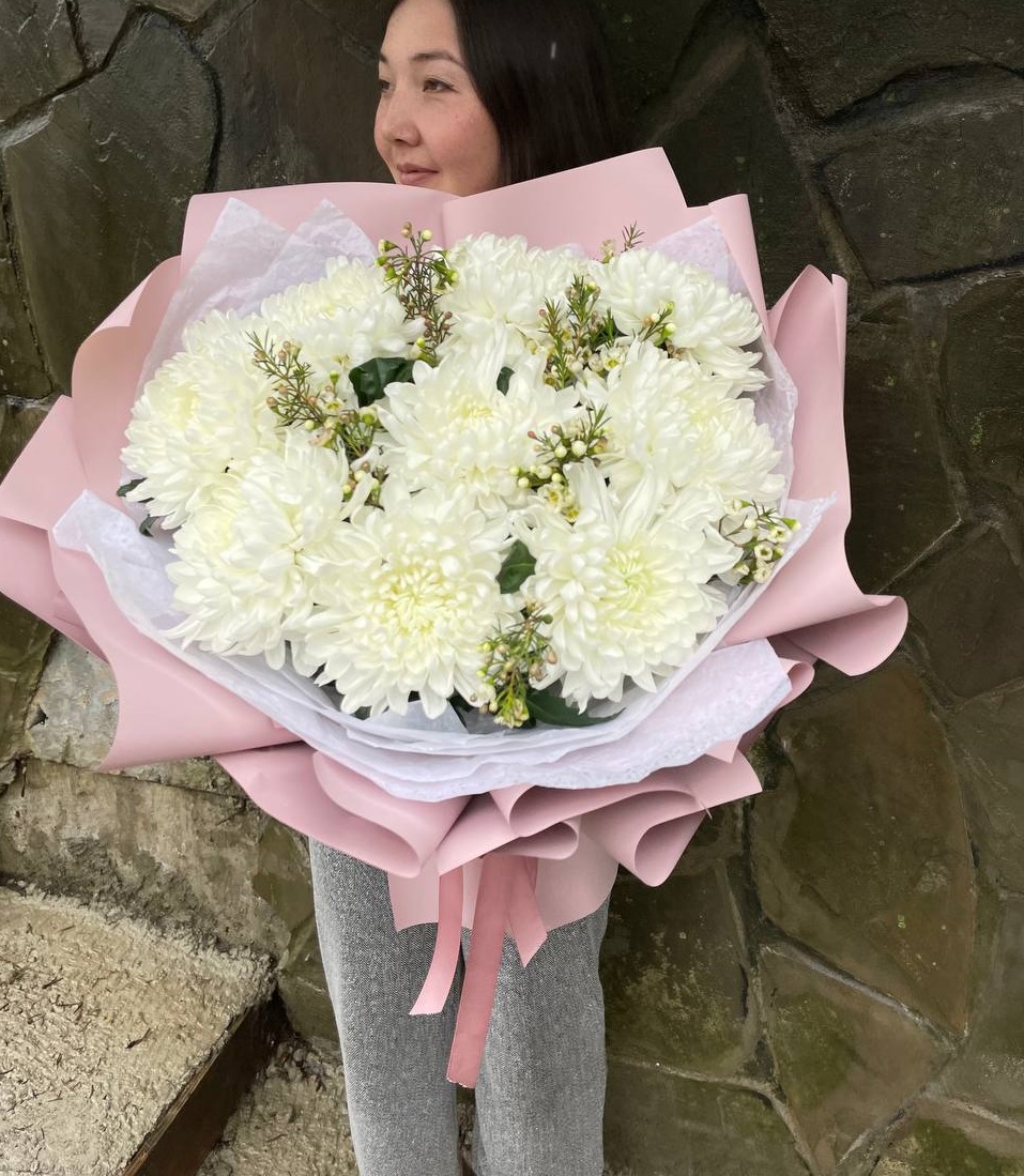 хризантема кустовая - 9 шт., лагурус, фоамиран, пленка,  лента.