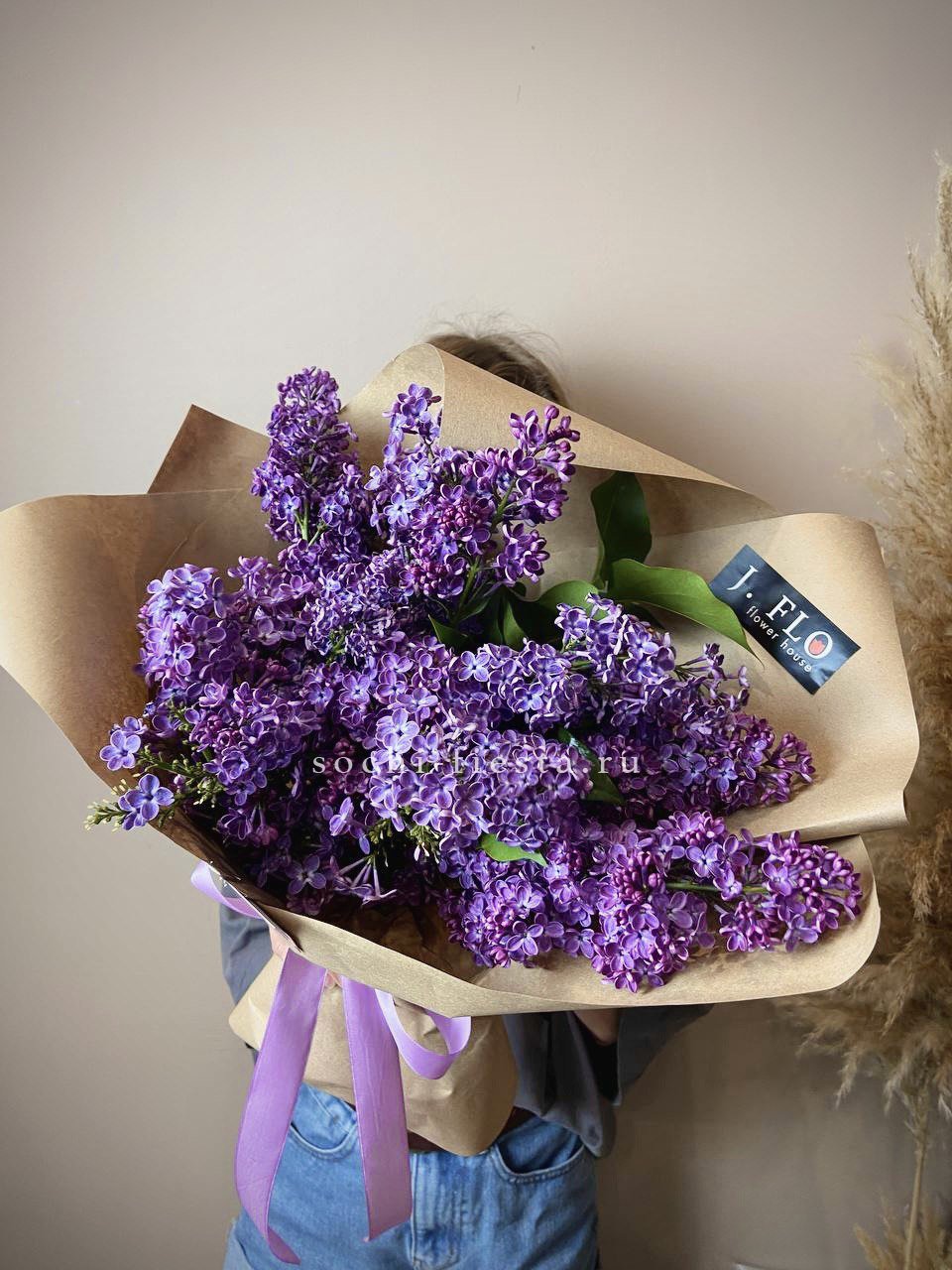 Пять веток сирени с пышными соцветиями и насыщенным ароматом. Букет напоминает о тёплых майских днях и прогулках в цветущем саду.