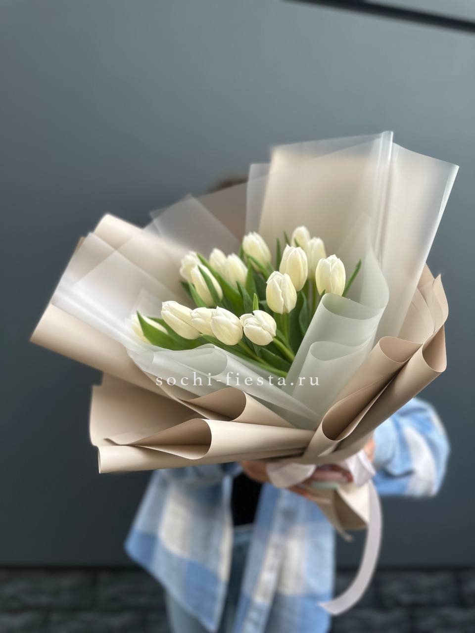 Одиннадцать тюльпанов в дизайнерском оформлении подойдут для весеннего жеста внимания. Цвет бутонов можно выбрать по вашему желанию.