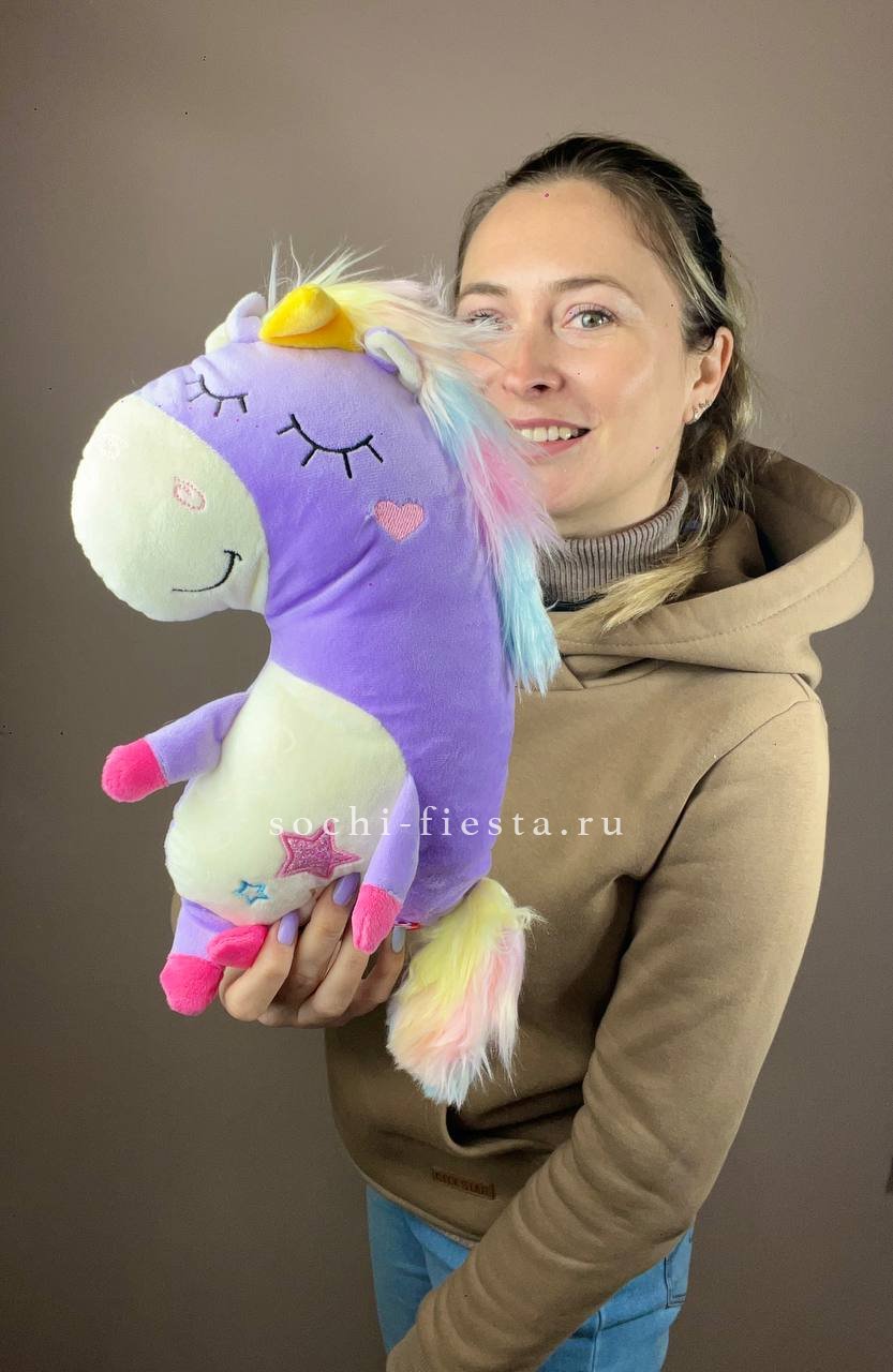 Единорог с радужной гривой притягивает взгляд яркими переходами оттенков. Его вытянутая форма и мягкая фактура делают игрушку приятной на ощупь и запоминающейся.