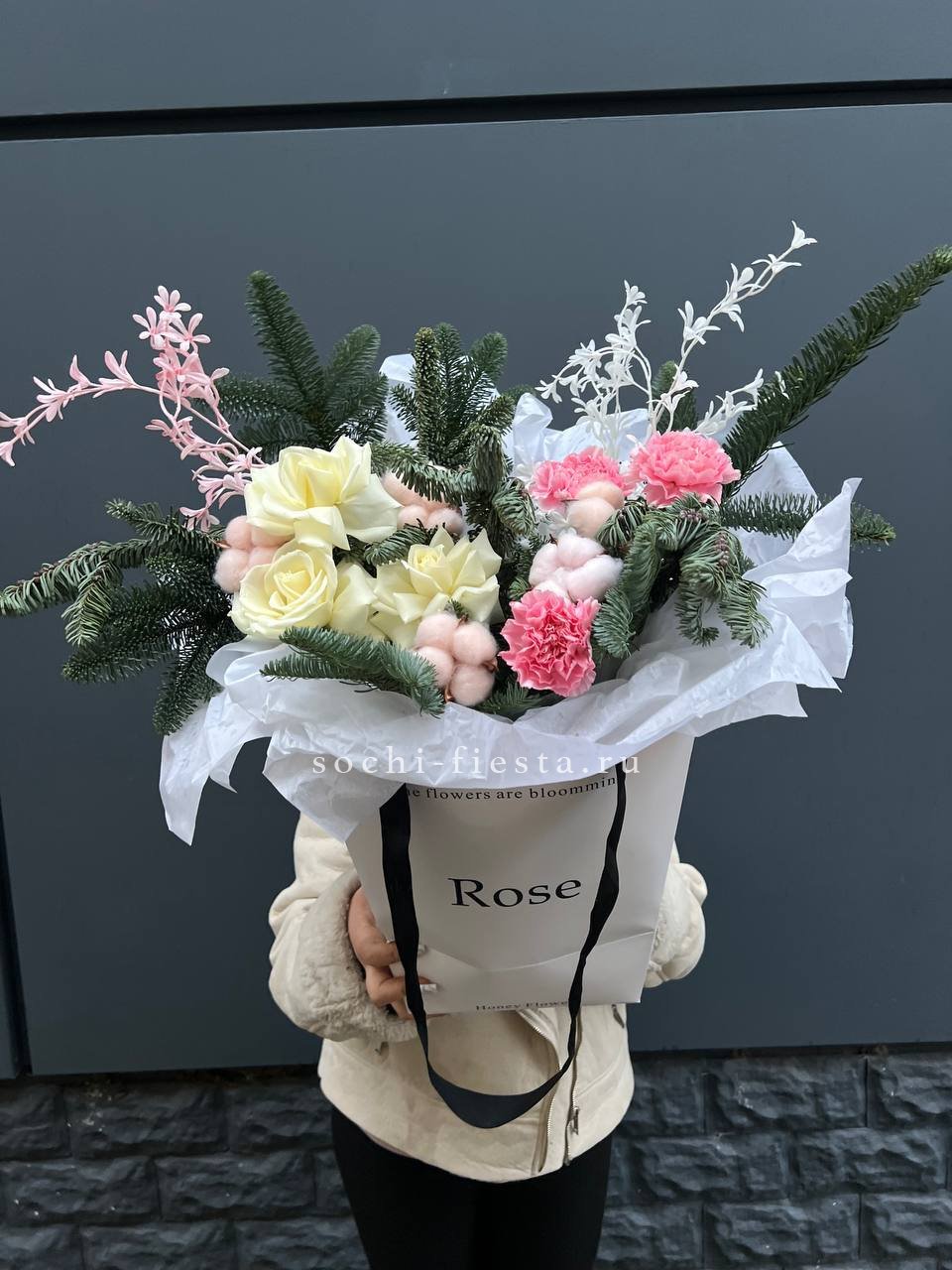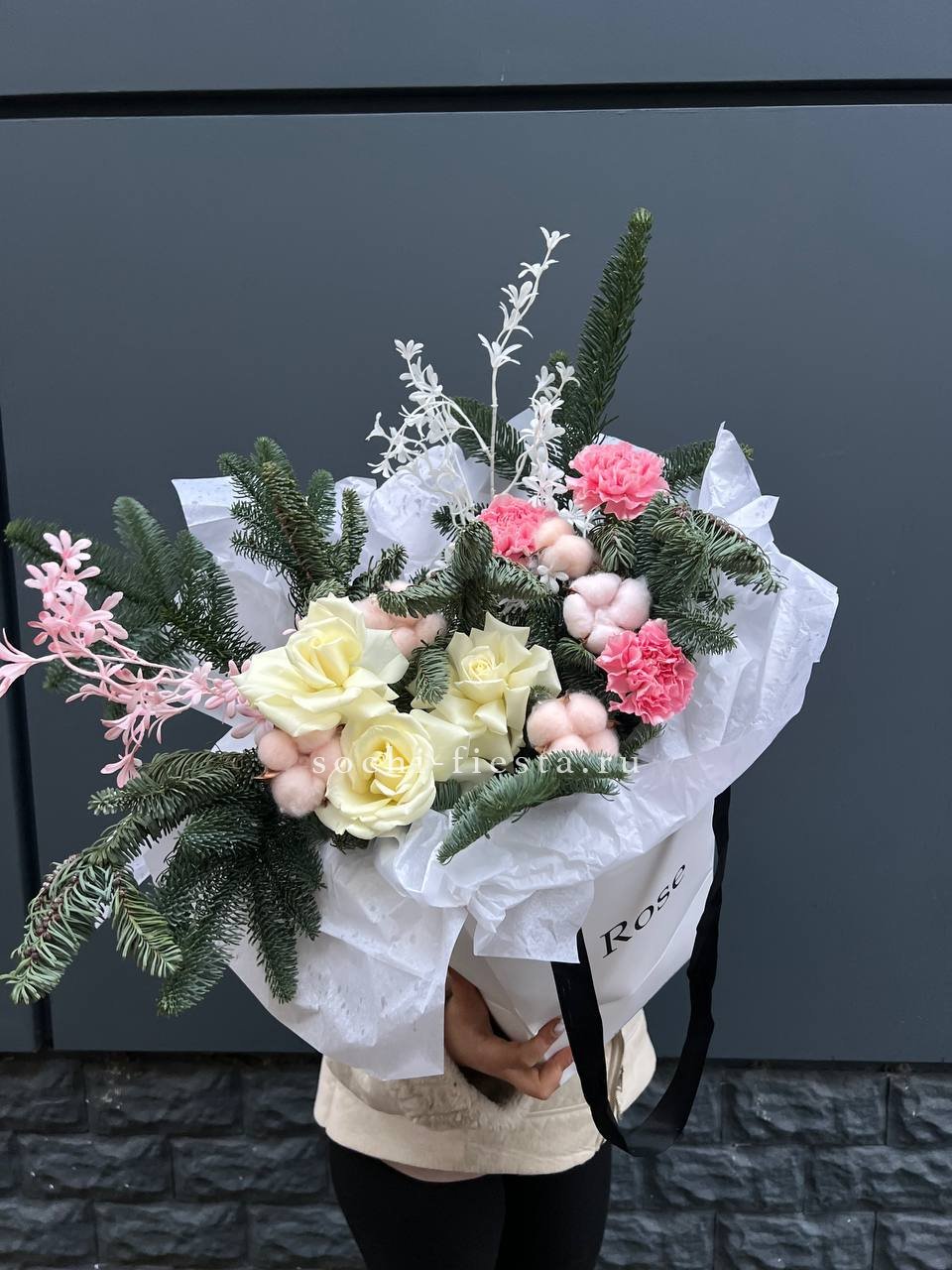 Белые розы и хлопок создают светлую основу, а нобилис вносит графичность. Диантус заполняет пространство мягкими переходами. Композиция выглядит объемно и сбалансировано.