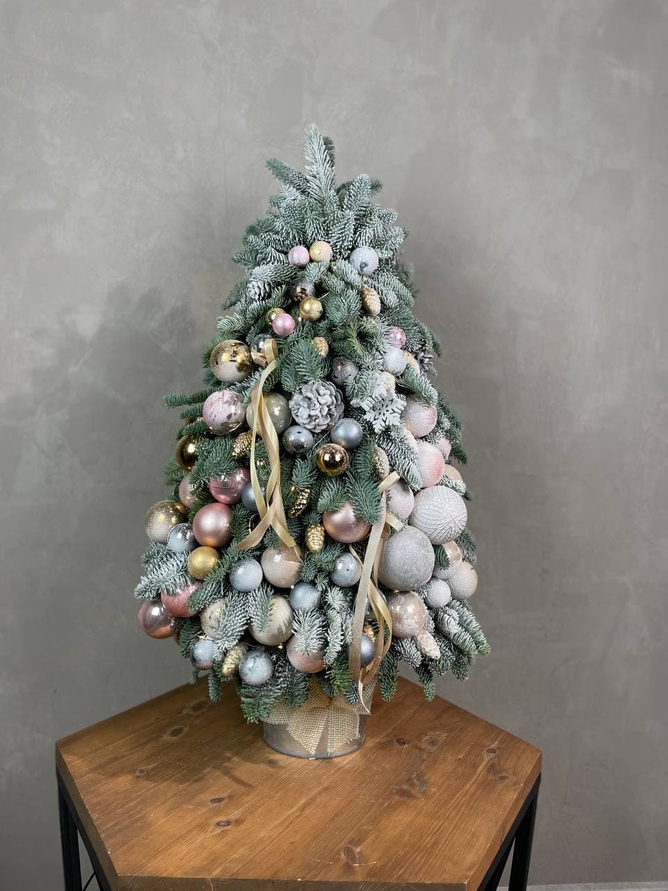 Пышная конструкция из веток датского нобилиса создает праздничный объем и заполняет пространство живой хвоей. Шары и ленты добавляют завершенность композиции. Готовое решение для создания новогоднего настроения в интерьере.