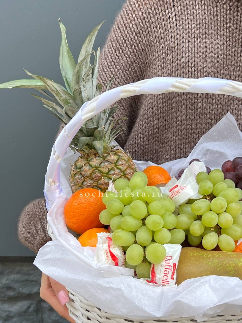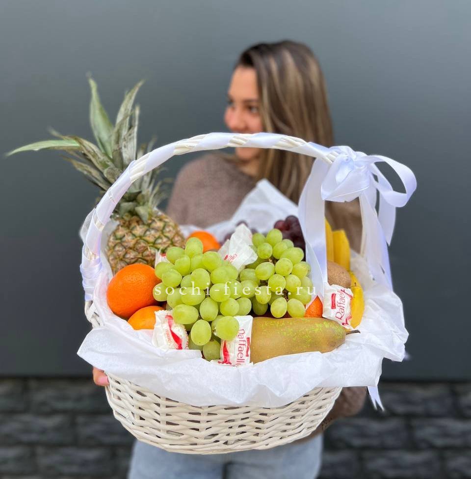 фруктовая композиция в корзине из винограда, бананов, яблок, мандарин, киви, ананаса и Raffaello