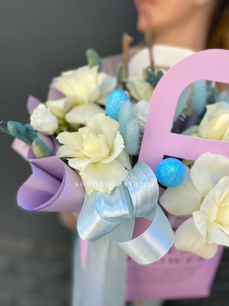 Белые розы собраны в компактную форму вместе с пушистым лагурусом и вербными ветками. Пасхальные яйца встроены в композицию как часть весеннего настроения. Сумочка удобна для размещения на столе.