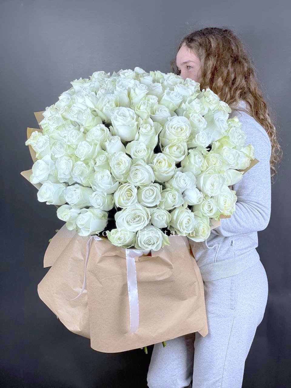 Сто одна роза белого цвета собрана в плетеную корзину и создает впечатление снежного сугроба. Такая композиция занимает пространство уверенно и притягивает взгляд своей безупречной чистотой.