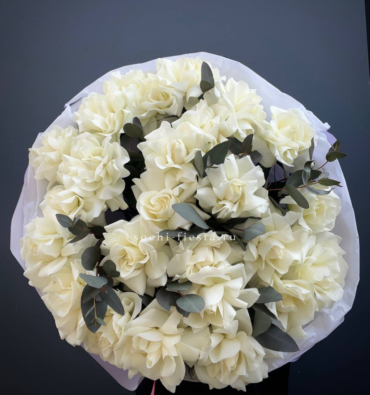 белые розы с эвкалиптом в сумочке.