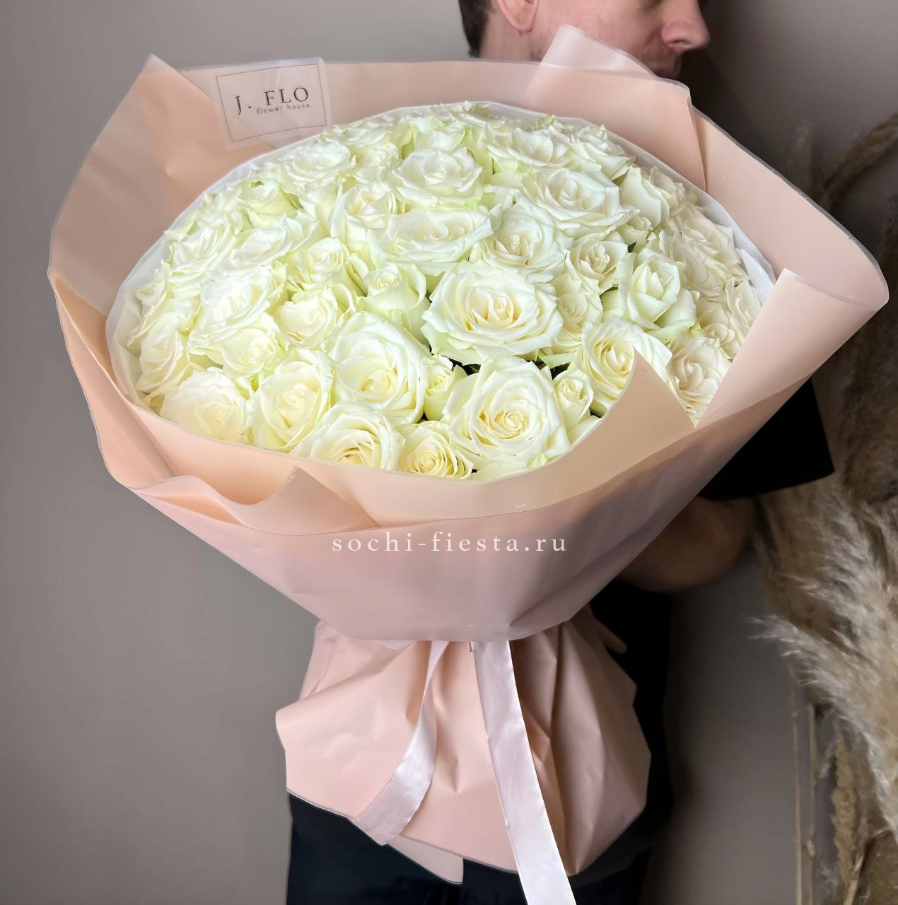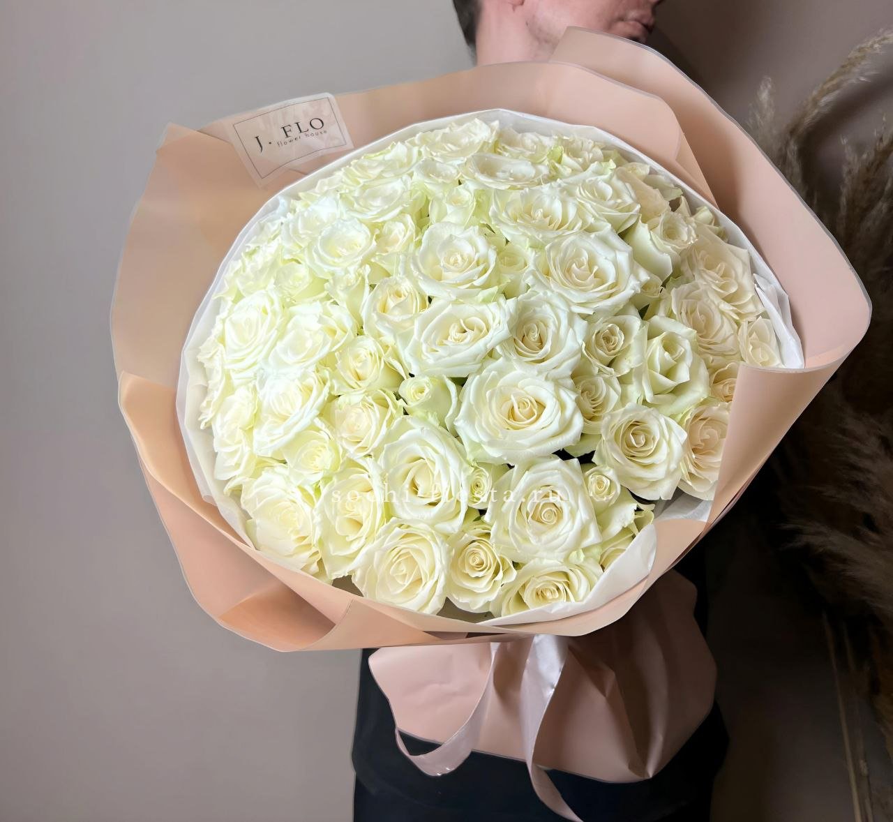 Белоснежные лепестки создают ощущение света и простора. Двадцать один бутон образует воздушную композицию с мягким переходом оттенков. Букет дарит момент тишины и покоя.