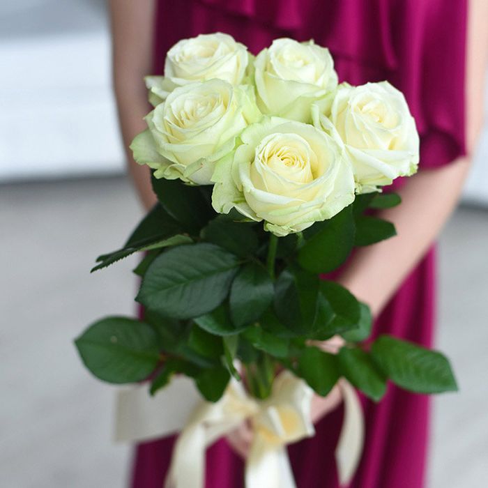 Пять белых бутонов собраны лаконично и перевязаны лентой. Живой акцент для рабочего стола или компактного пространства. Свежесть без лишних деталей.