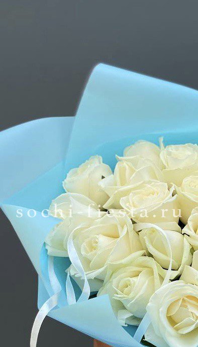 Пятнадцать белоснежных роз собраны в аккуратную форму с ровным силуэтом. Композиция сохраняет свежесть и держит структуру благодаря продуманному размещению бутонов в цилиндре.