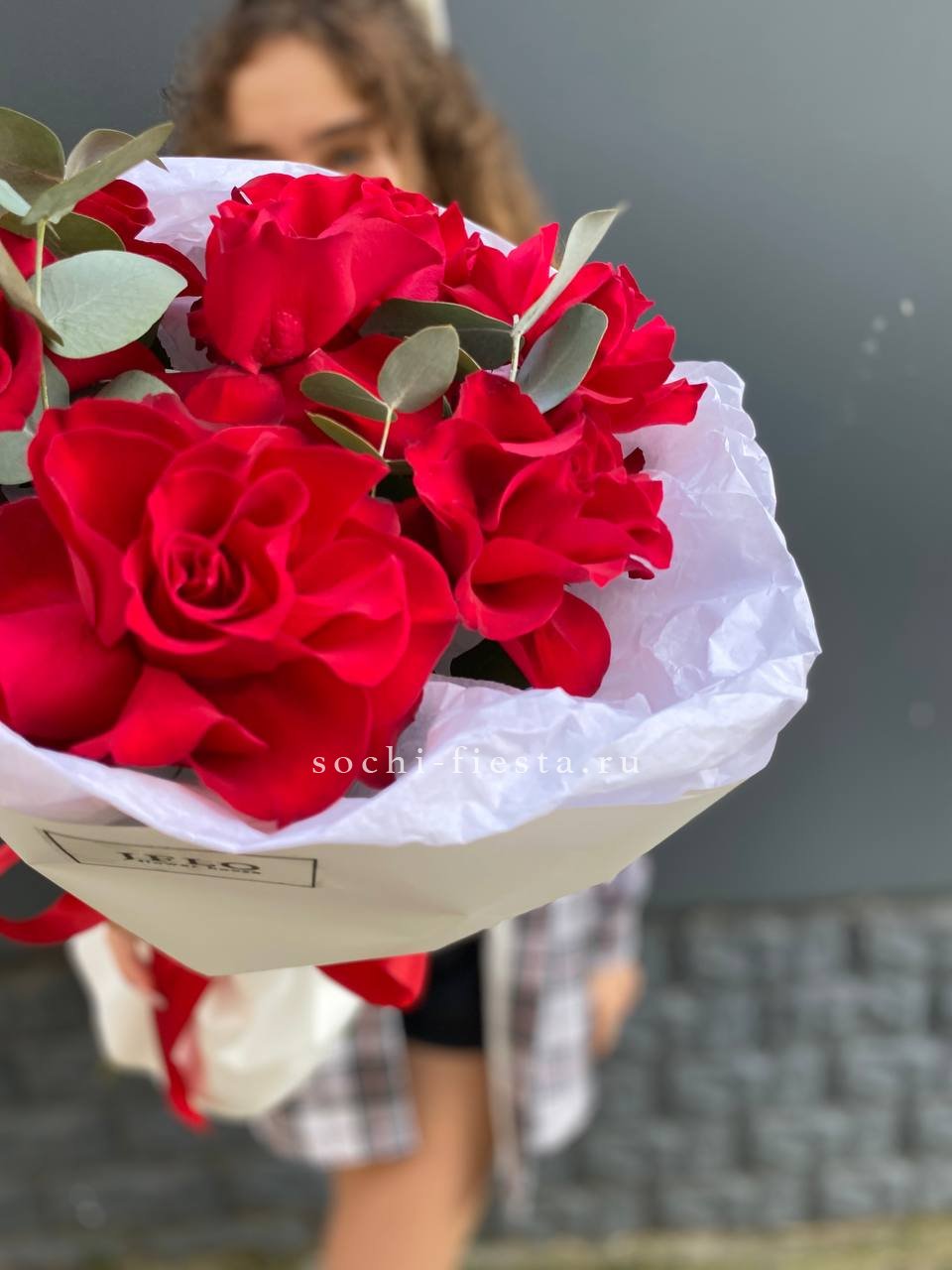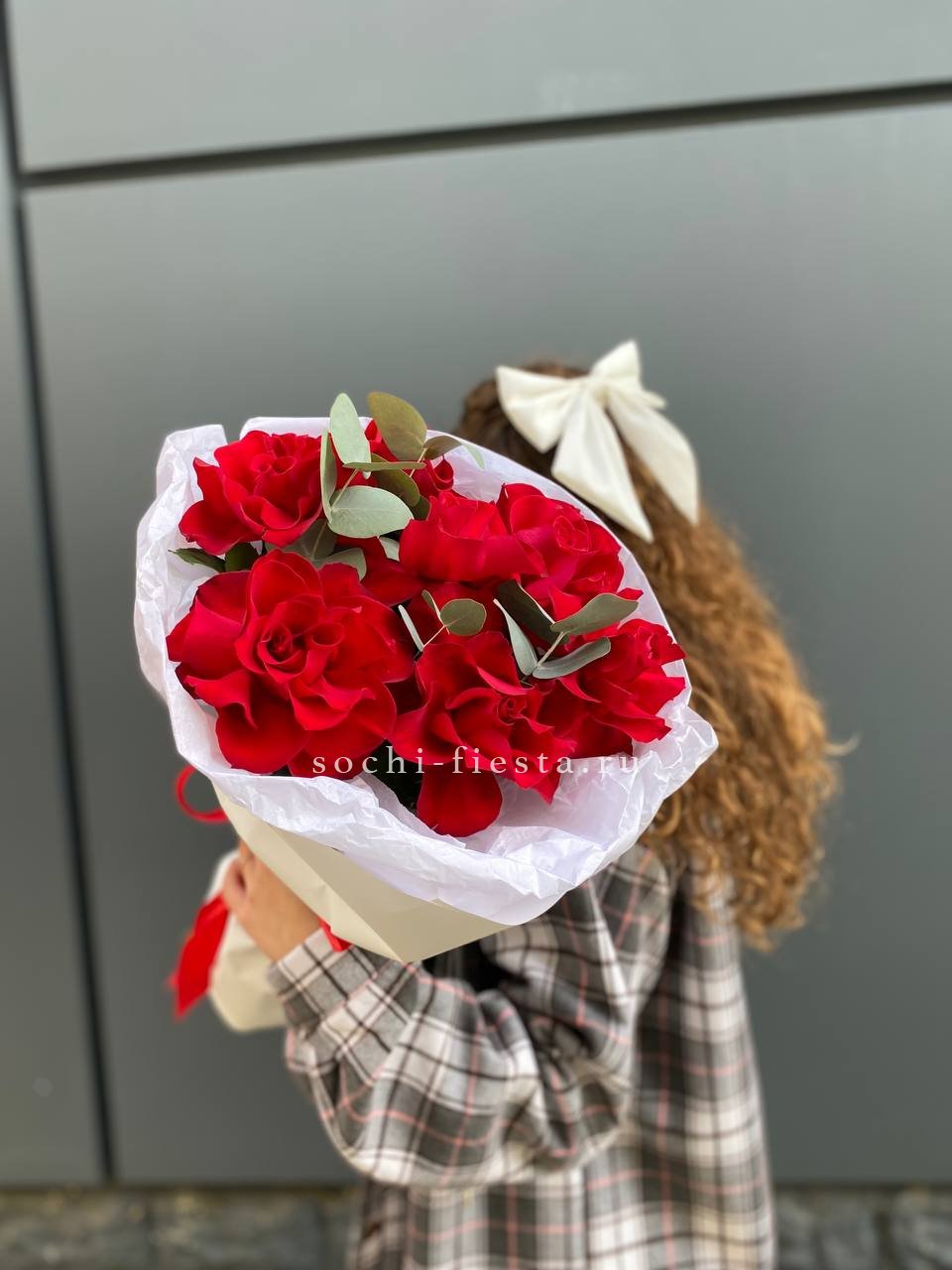 Девять бутонов насыщенного алого оттенка в лаконичной матовой обёртке. Каждый цветок раскрыт в полную силу, образуя плотную округлую форму с выразительным силуэтом.