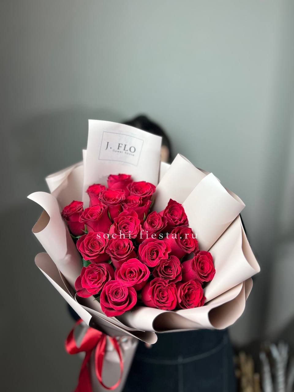 Девять роз глубокого красного цвета в комбинированной обёртке. Бутоны с плотной текстурой лепестков создают яркое визуальное присутствие и долго сохраняют свежесть.