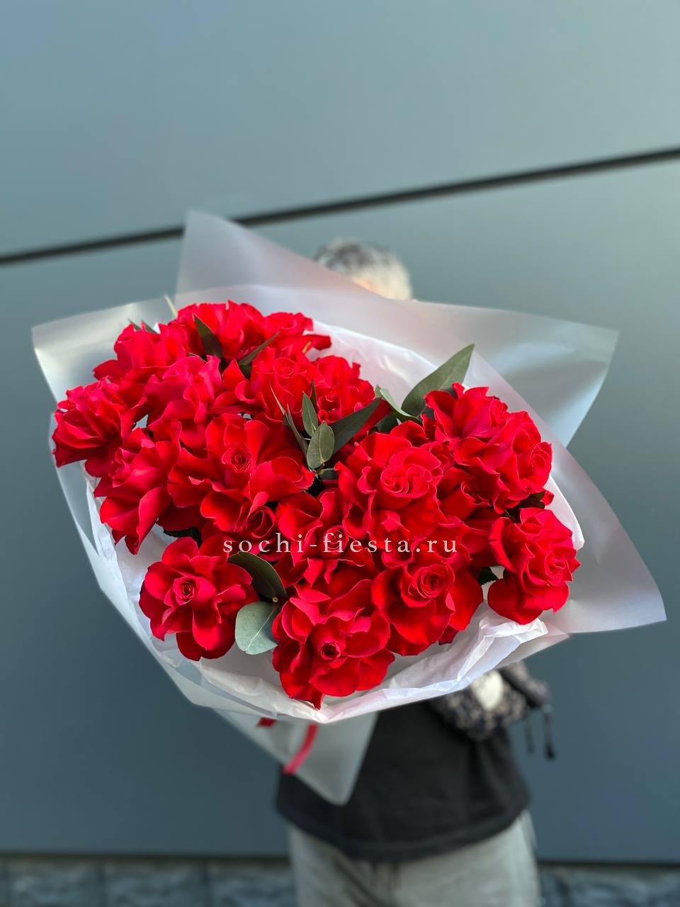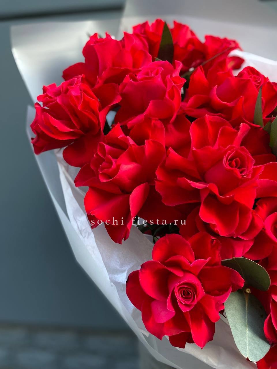 Яркие красные головки роз привлекают взгляд и удерживают его. Цвет насыщенный и живой, букет выглядит выразительно в любом освещении.