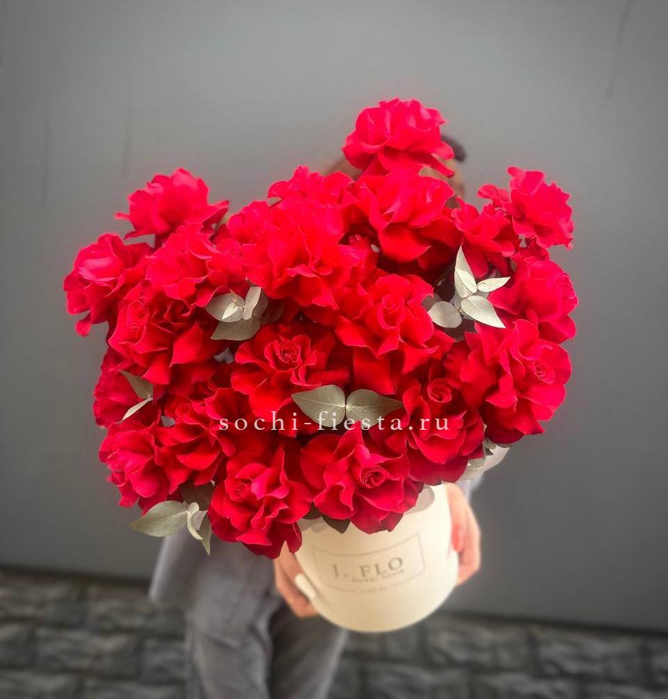 Тридцать три бутона выстраиваются в плотную композицию с четким силуэтом. Красный оттенок заполняет пространство без пустот, создавая насыщенное впечатление. Дизайнерская упаковка удерживает форму и добавляет завершенность.
