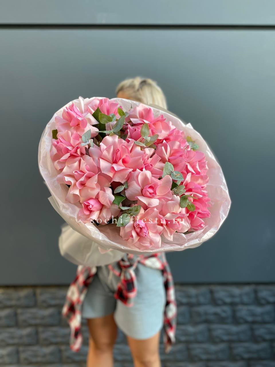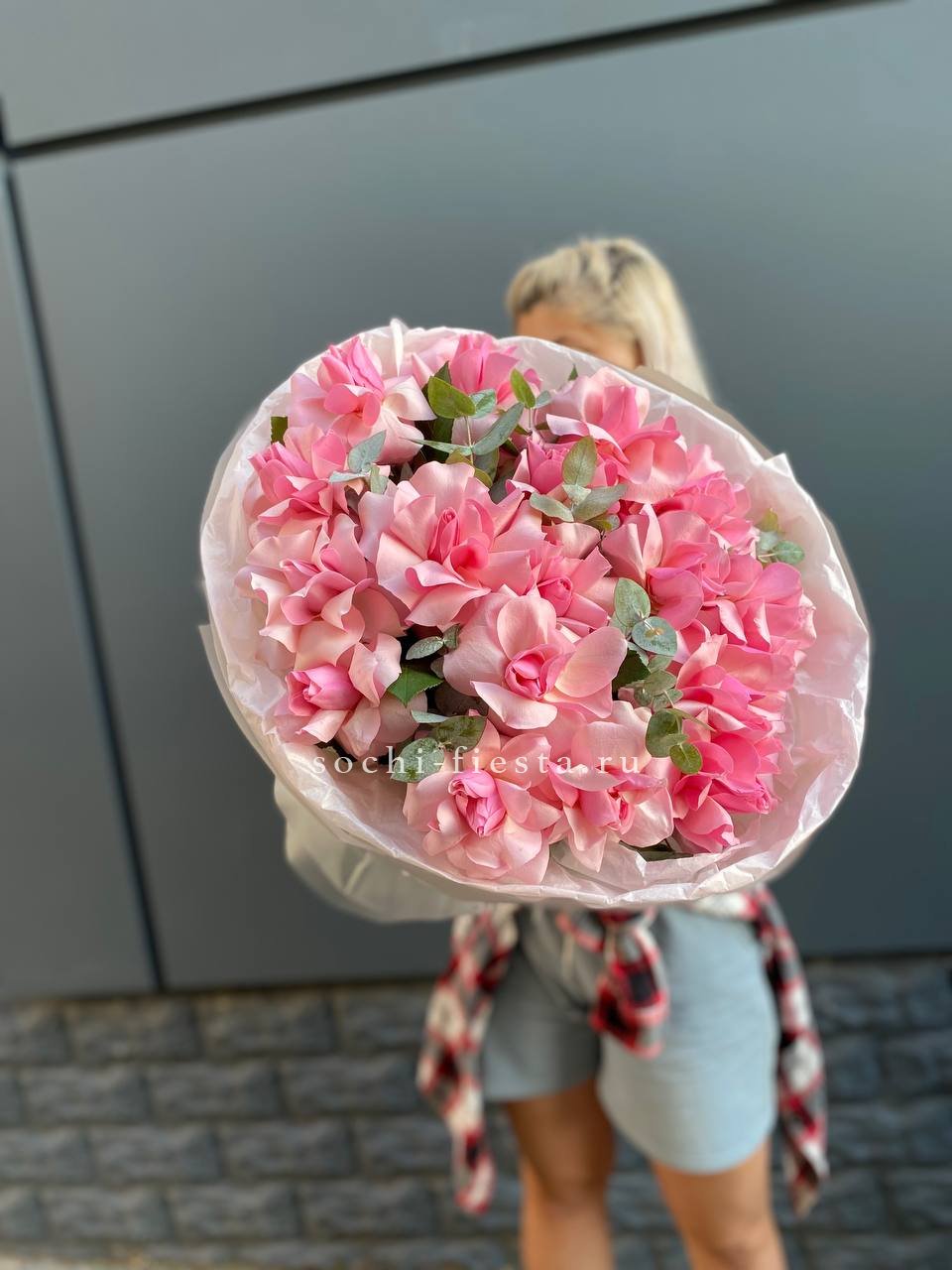 Сто одна роза в розовой гамме выстраивается в масштабную композицию. Такой букет заполняет всё видимое пространство и создаёт впечатление цветочной инсталляции с первого взгляда.