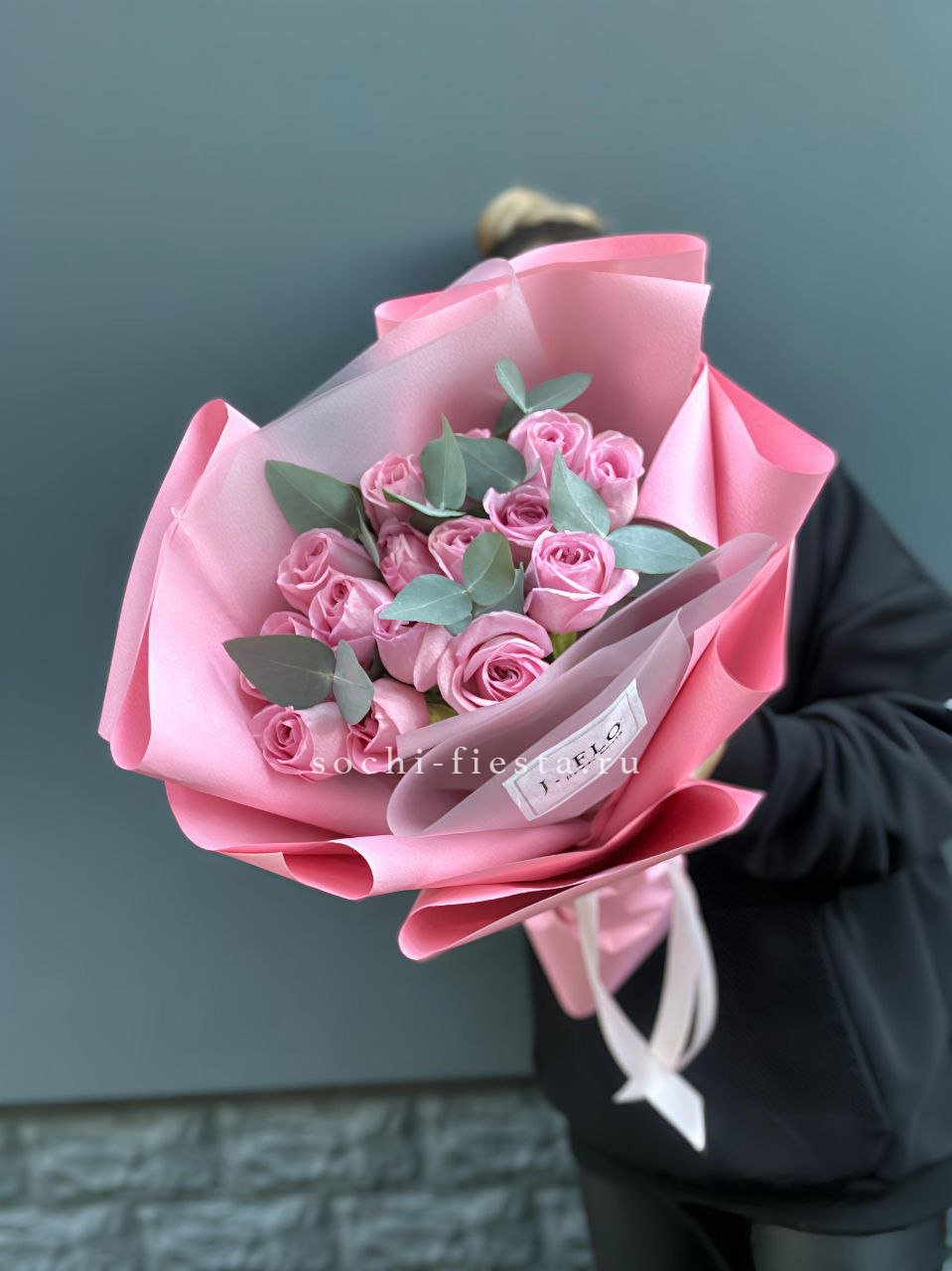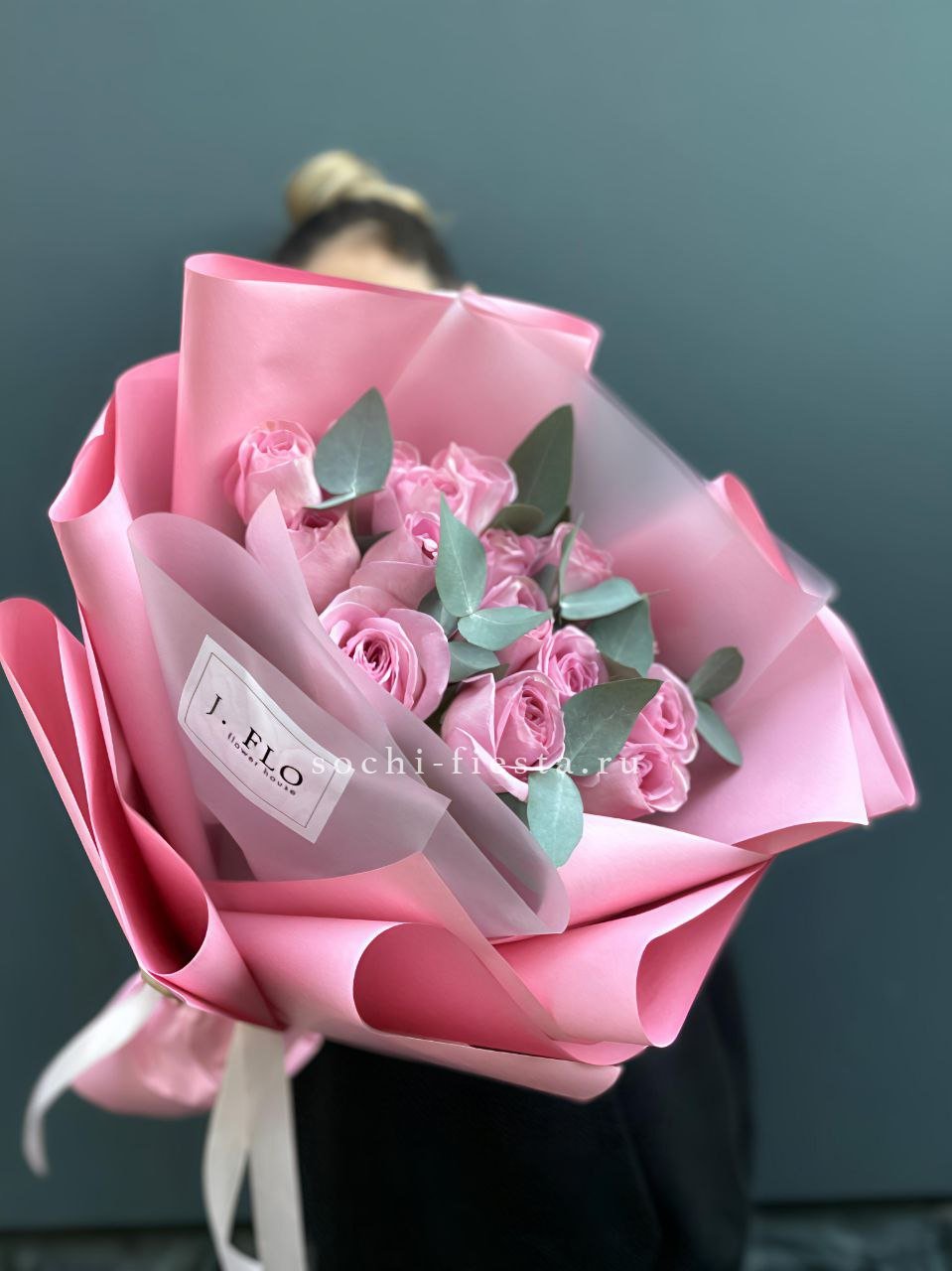 15 розовых роз, эвкалипт, дизайнерская упаковка.
