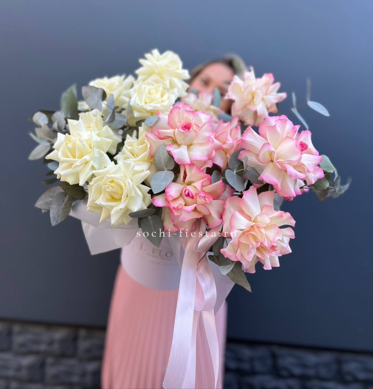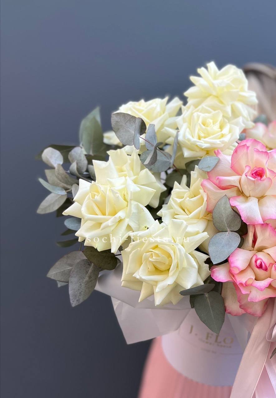 вывернутые розы - 19 шт., эвкалипт - 1шт., лента, авторская упаковка.