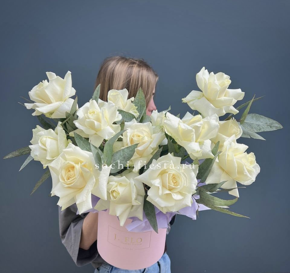 Семь вывернутых роз образуют компактную группу с чистым силуэтом. Ветки эвкалипта задают вертикальный ритм и добавляют воздуха между бутонами. Букет держит форму и выглядит собранно.