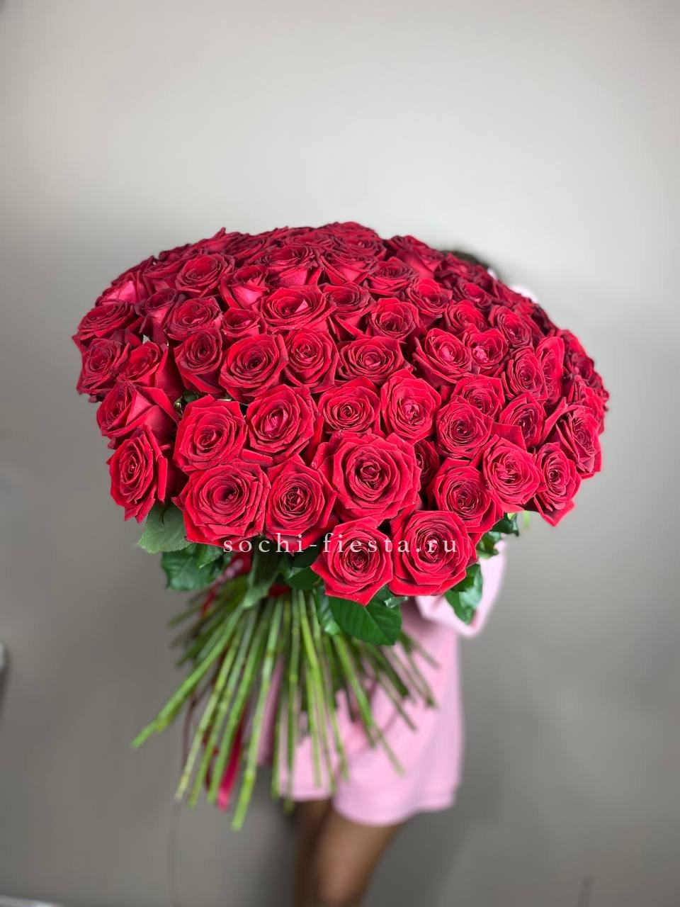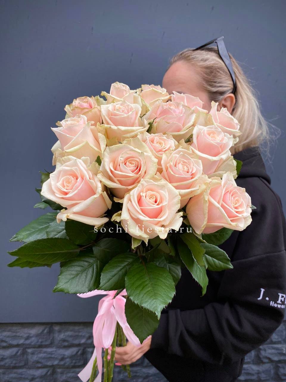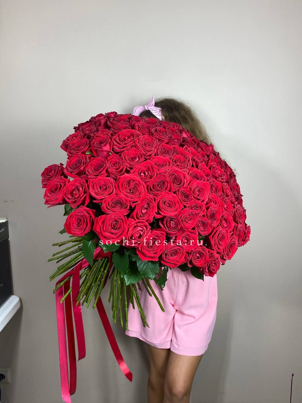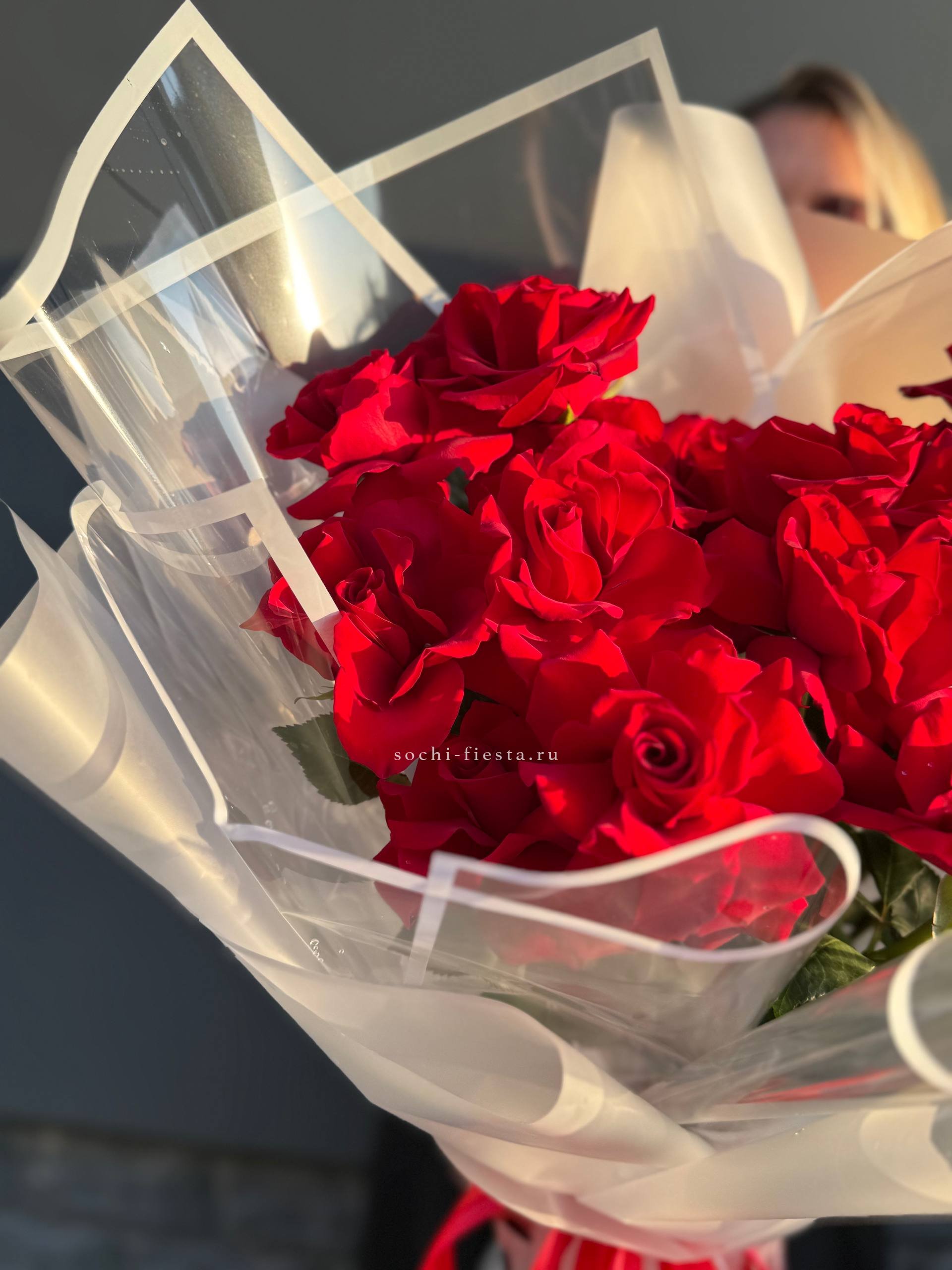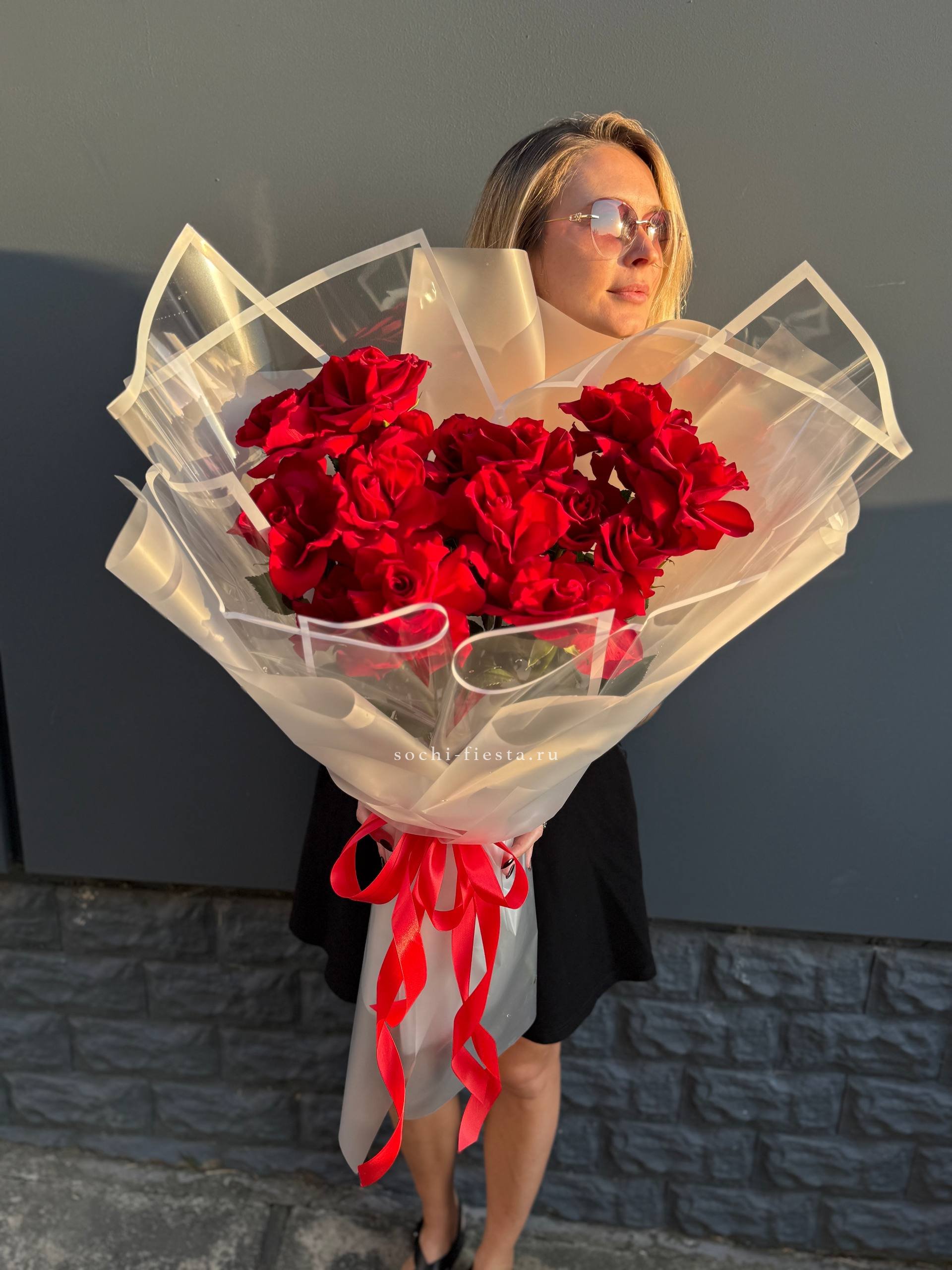 Двадцать пять стеблей выстроены в объёмную композицию с выразительным присутствием. Авторское оформление добавляет завершённость и подчёркивает масштаб букета.