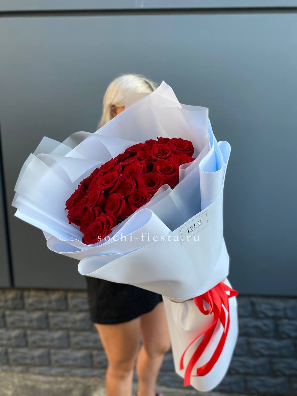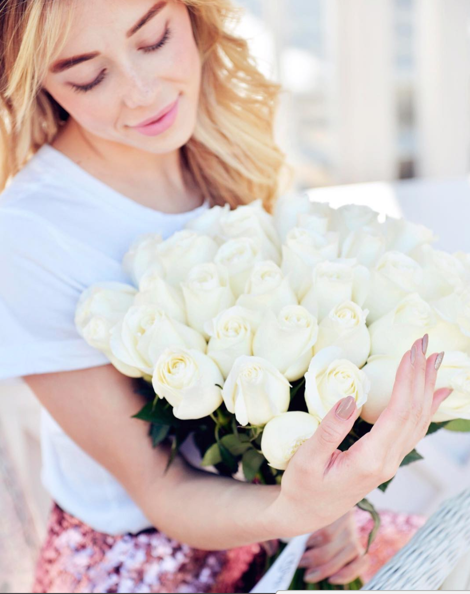 Пятьдесят один белоснежный бутон создаёт объёмное облако с мягкими переходами света и тени. Голландские розы держат форму и заполняют пространство плотной текстурой лепестков.