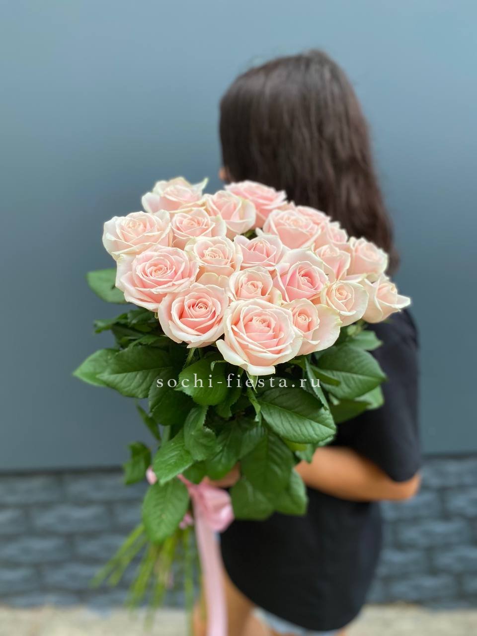 Пятнадцать розовых роз с длинными стеблями образуют воздушную композицию. Бутоны раскрыты неравномерно, что добавляет букету живую динамику и объём.