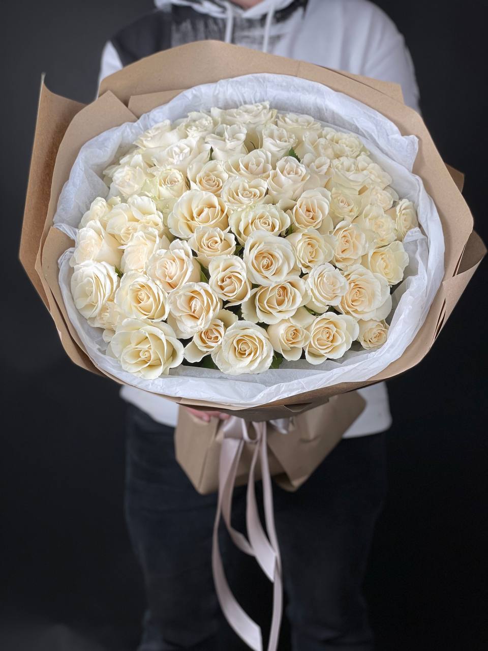 Белые головки собраны в плотный купол без единого просвета. Пятьдесят один бутон создает монолитную форму, где каждый цветок поддерживает соседний. Лаконичная упаковка сохраняет чистоту линий и фокус на безупречной геометрии композиции.