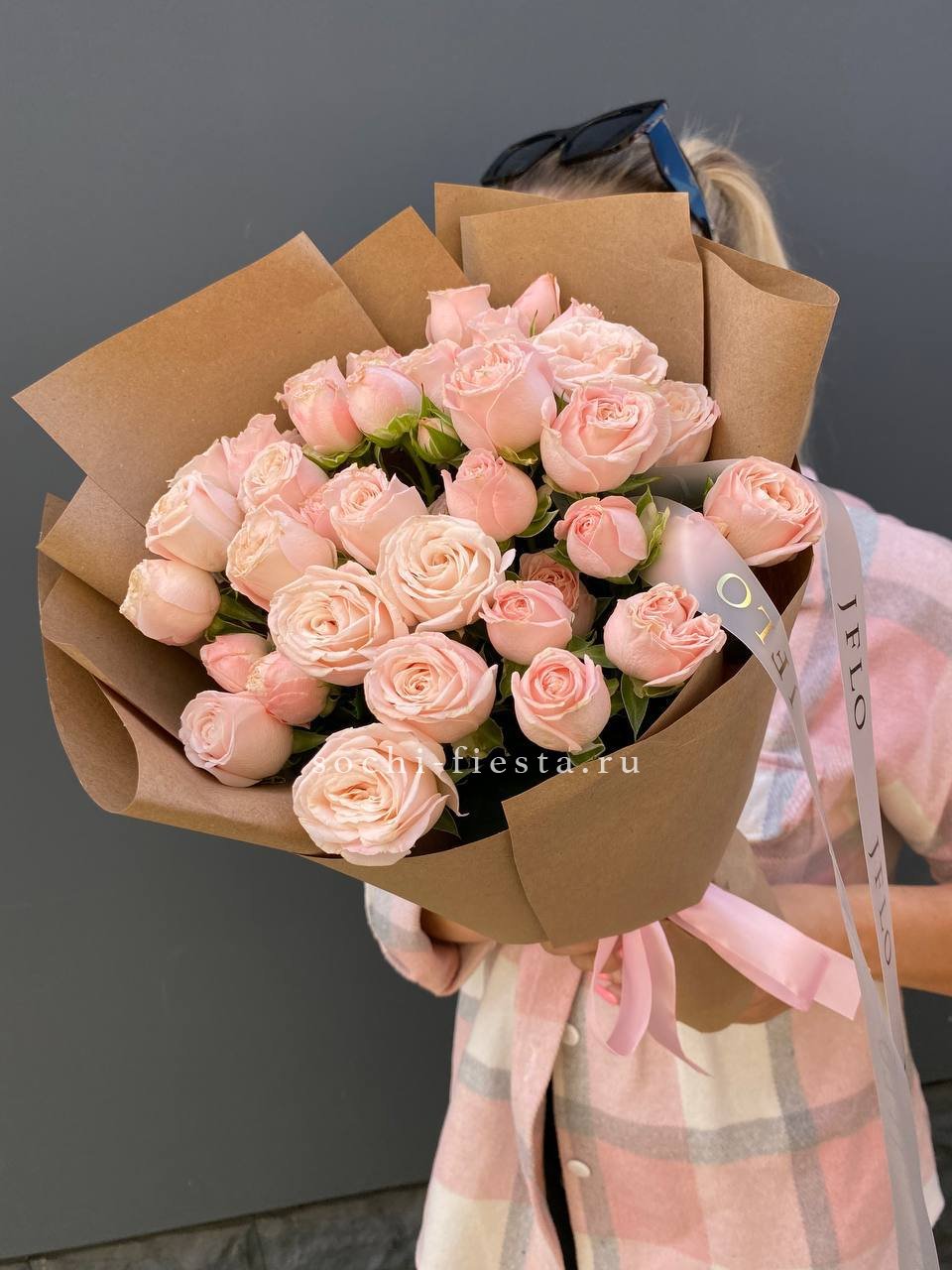 Двадцать пять кустовых роз Бомбастик собраны в пышную композицию с выраженной округлой формой. Плотные многолепестковые бутоны располагаются близко друг к другу, создавая насыщенный визуальный ритм и объемную структуру букета.