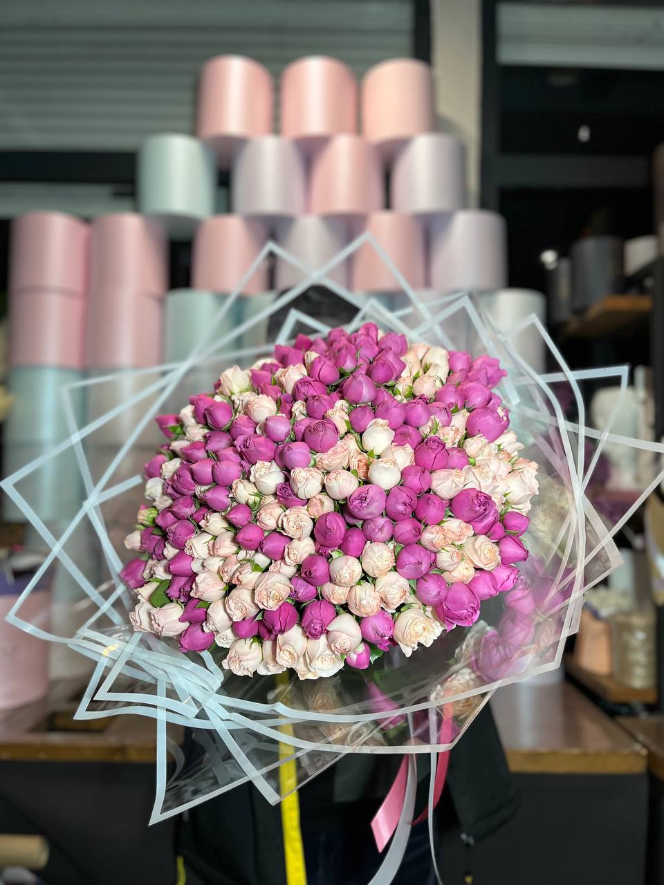 Мы работаем только со свежими цветами — букеты радуют от 7 до 14 дней и дольше при правильном уходе.