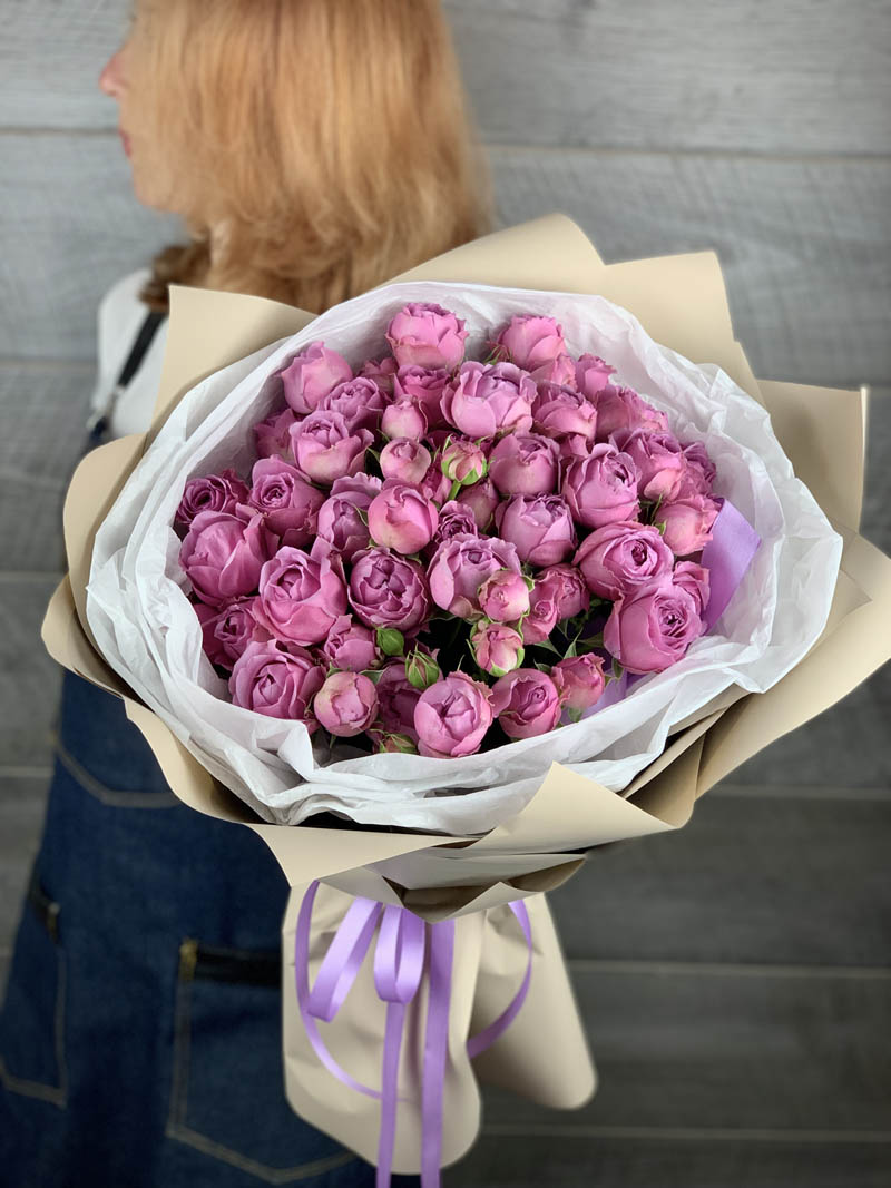 Пятнадцать бутонов Мисти Бабблс с лавандовым отливом и припыленной текстурой лепестков. Компактная форма и сдержанная гамма создают ощущение утренней свежести.