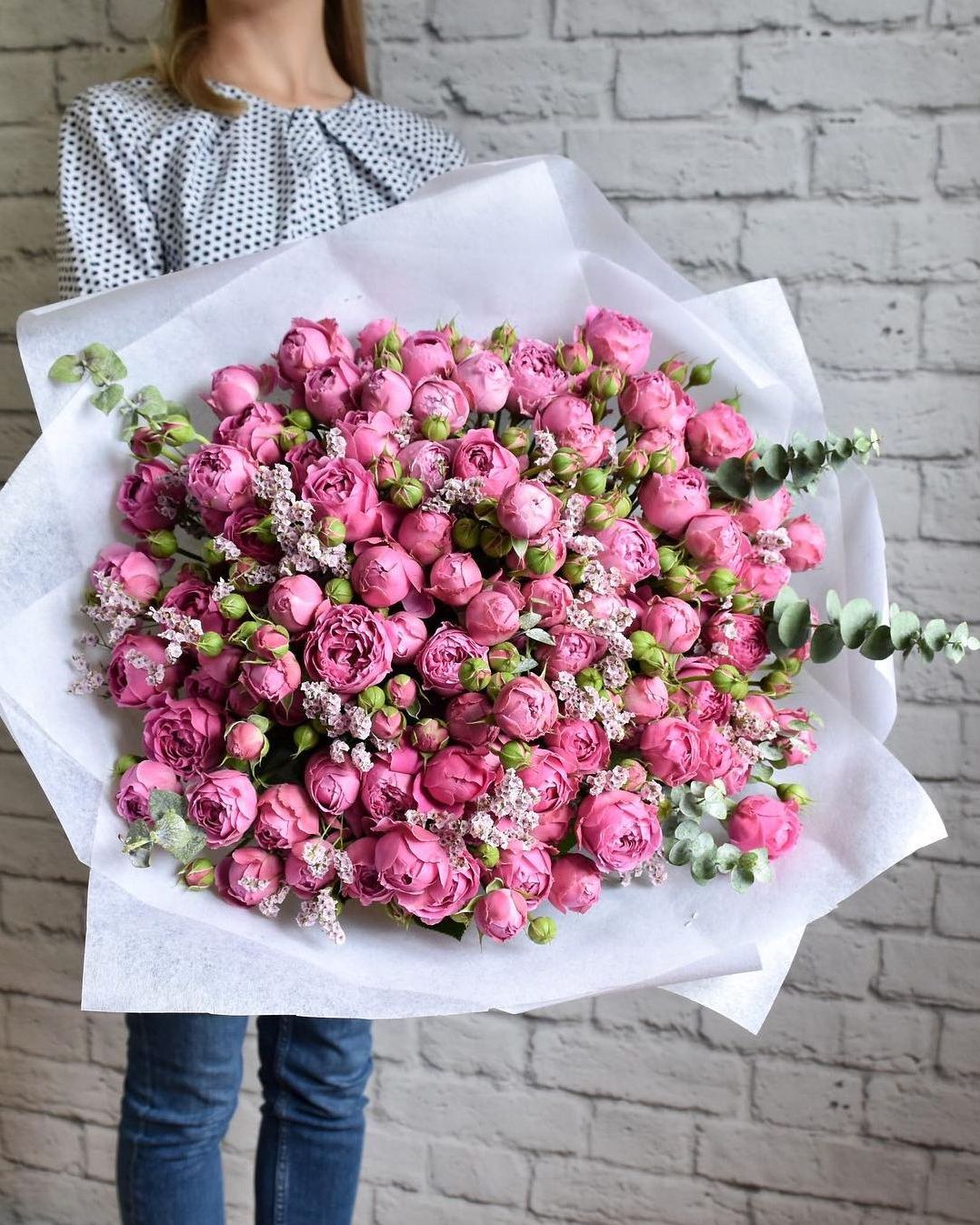 Пятнадцать роз Мисти Бабблс с пышными многослойными бутонами создают объёмную композицию с живой текстурой. Лепестки раскрываются волнами, образуя плотную шапку с мягкими переходами оттенков. Веточка эвкалипта добавляет свежести и завершает образ.