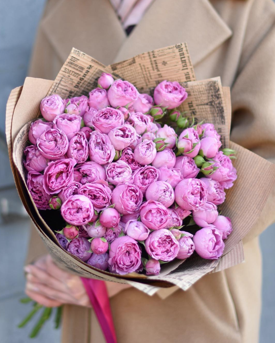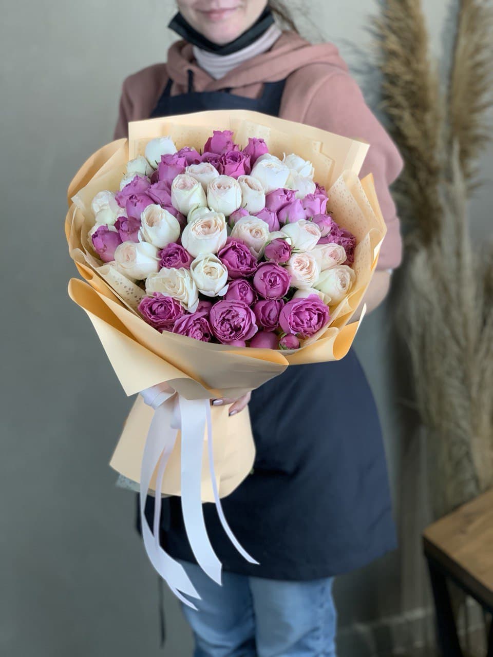 пионовидные кустовые розы Бомбастик и пионовидные кустовые розы Мисти Баблс - 201 шт., лента, светлая корзина D40.